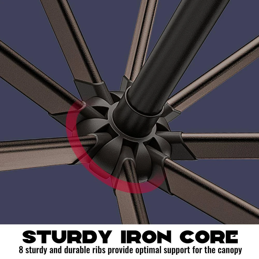 - Cantilever patio umbrella has 8 strong steel ribs, it is in sturdy and durable material forming a sturdy umbrella frame and the iron pole and steel ribs are powder coated in an antique bronze color for rust resistance