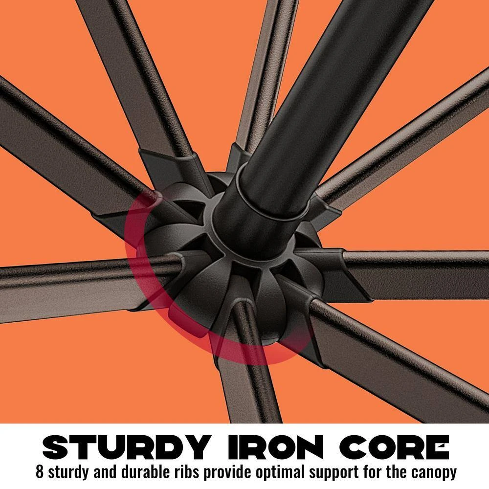 - Cantilever patio umbrella has 8 strong steel ribs, it is in sturdy and durable material forming a sturdy umbrella frame and the iron pole and steel ribs are powder coated in an antique bronze color for rust resistance
