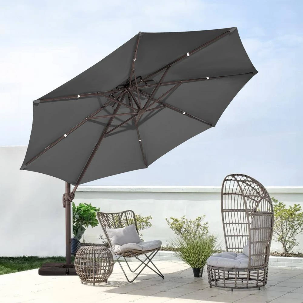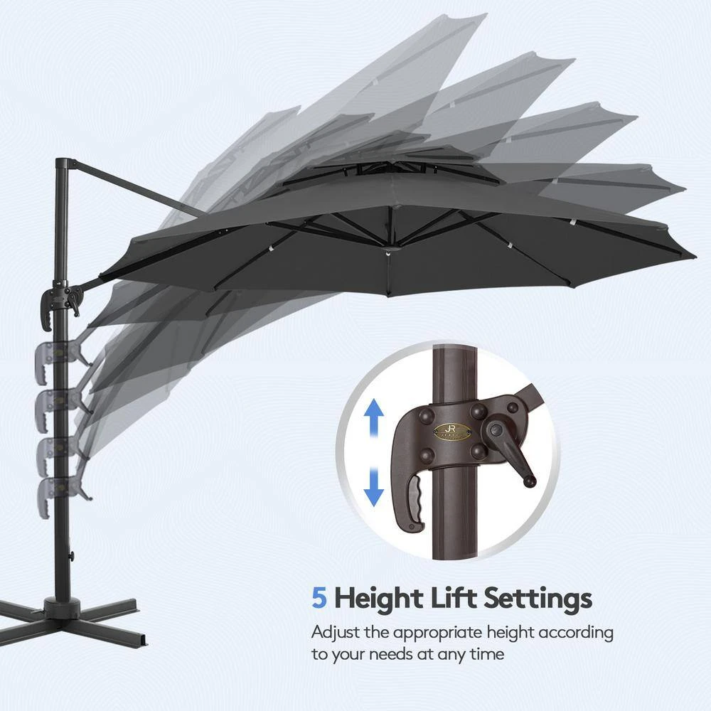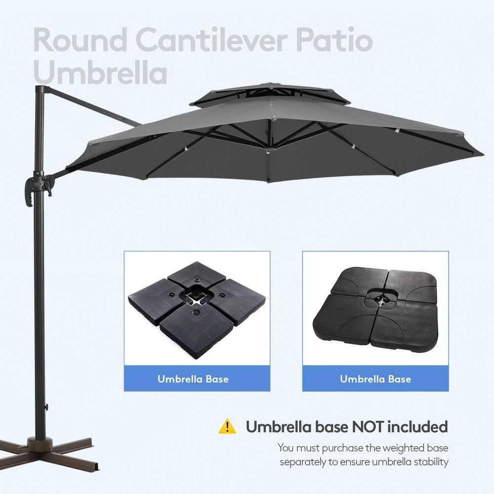 Relax outside day or night with our durable and chic 10 ft. cantilever patio umbrella. While the weather-resistant canopy protects you from the sun’s heat and harmful rays. Our umbrella can provide shade for a round or rectangle table with up to 9 chairs. You can use it in residential and commercial locations, e.g. gardens, yards, pool, deck, background beach, balcony, restaurant, and other outdoor areas. CAUTION and CARE – To make this type of umbrella stable, you must purchase a weighted base separately, use a sandbag or bricks, or nail the foundation to your deck. NOTE – The weighted base is not included in this item. We Highly Recommend you can search these OMSIDs to match it: 328563934