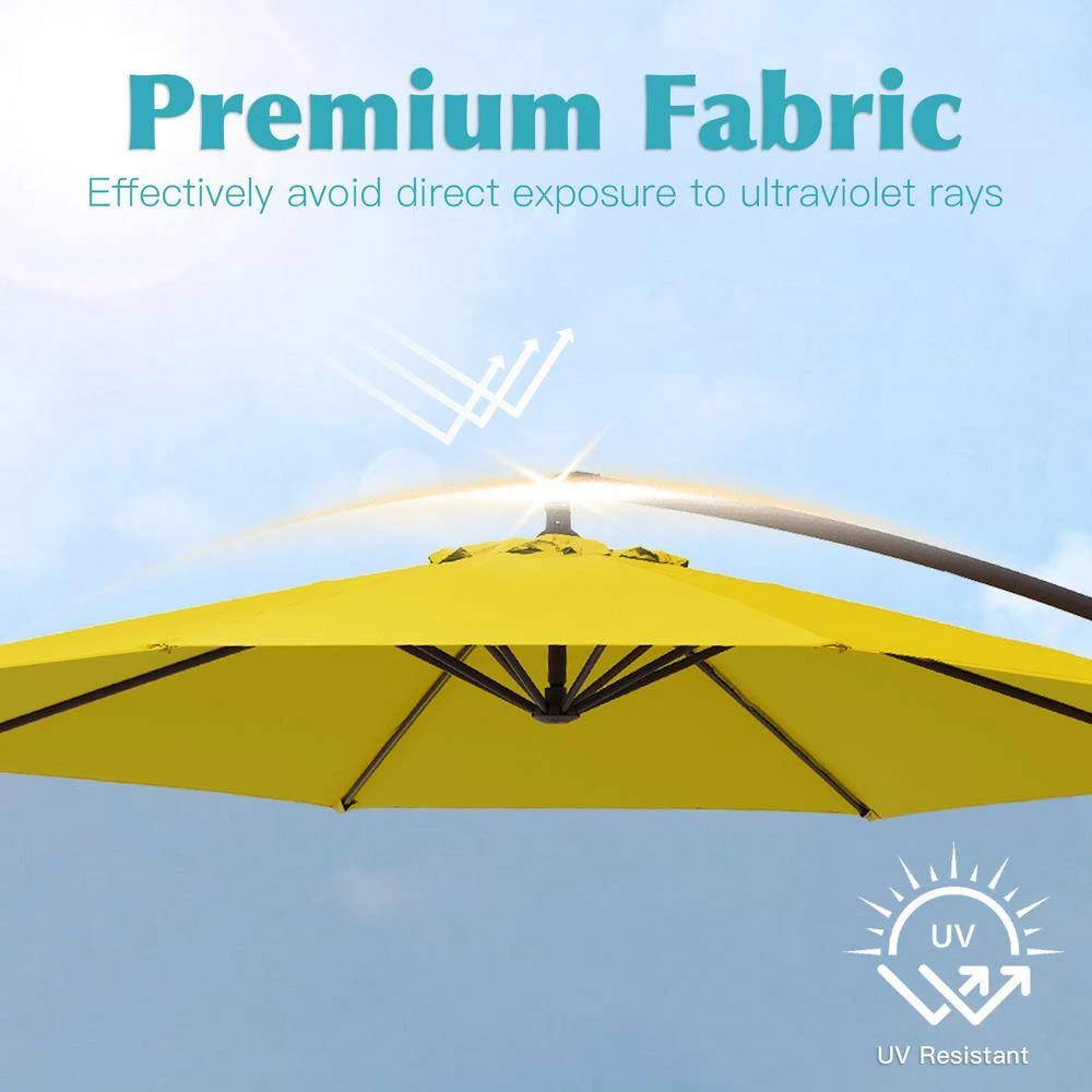 Get a new cantilever umbrella for your backyard or garden now. A wonderful solution for any leisure time outside under bright Sunshine. Even this umbrella can be used for commercial use, but outside of your store for those customers who want to sit outside the room. Please Note: Stand included, counterweight included as well(need to fill by yourself).