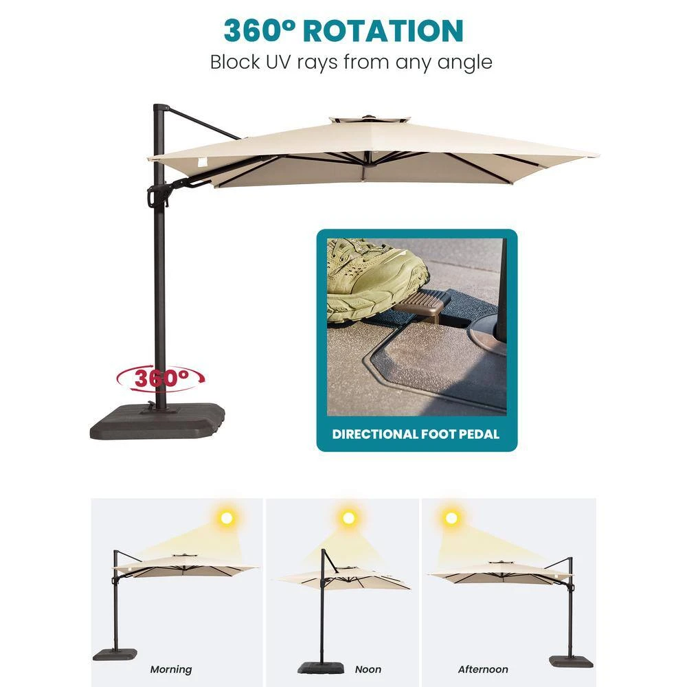 - 360°rotation- just by lightly stepping on the foot pedal below, the double top deluxe square umbrella can be rotated 360°, providing you with a comfortable and cool shade