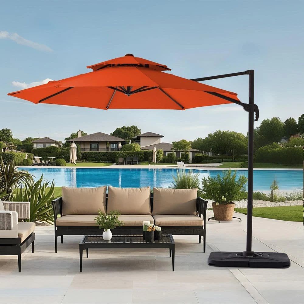 This patio umbrella brings wonderful outdoor leisure time. It is made of a powder-coated aluminum frame and 8 heavy-duty ribs, which are more durable and sturdier to use longer. The double top umbrella features a wind vent for better air circulation to provide a cool environment under the umbrella. A durable polyester canopy provides more shade areas for you and your friends. In addition, it is fade-resistant, water-proof, and sun-protection to be perfectly used outdoor without too much glare sunlight. 360-degree rotation function satisfy your various needs.Note: Weighted base Not included. We Highly Recommend you can search these OMSIDs to match it: 320892032 (250lbs weighted base)