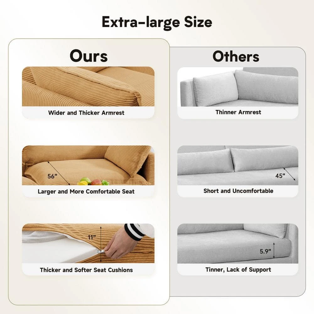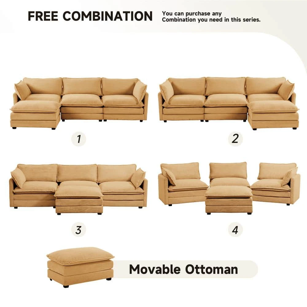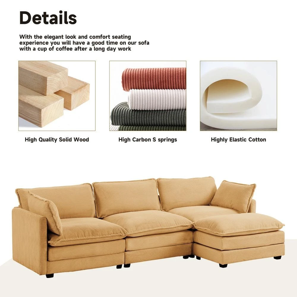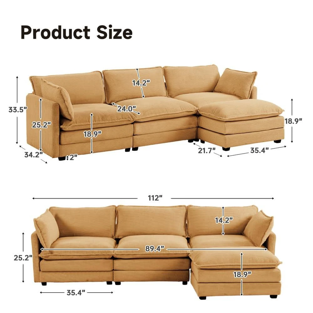 112 In. W 4-Piece Modern Straight Arm Corduroy Fabric L-Shaped Sectional Sofa With Ottoman In Yellow