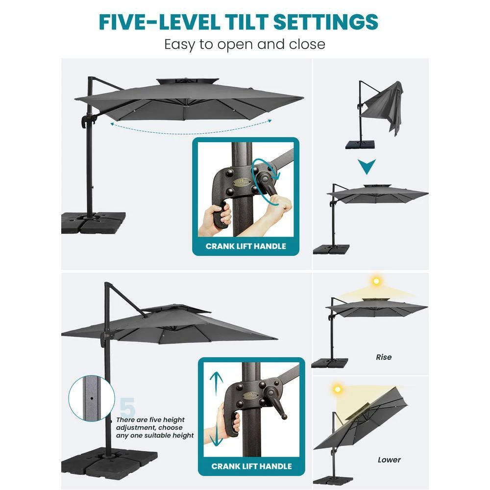 - CRANK AND TILT SYSTEM DESIGN – This patio cantilever umbrellas is easy to opening and closing with it’s crank and tilt system. Convenient slide and lock operation system offers multiple angles of shading that helps you keep the sun out from many angles and creates cool and comfortable environment for your family