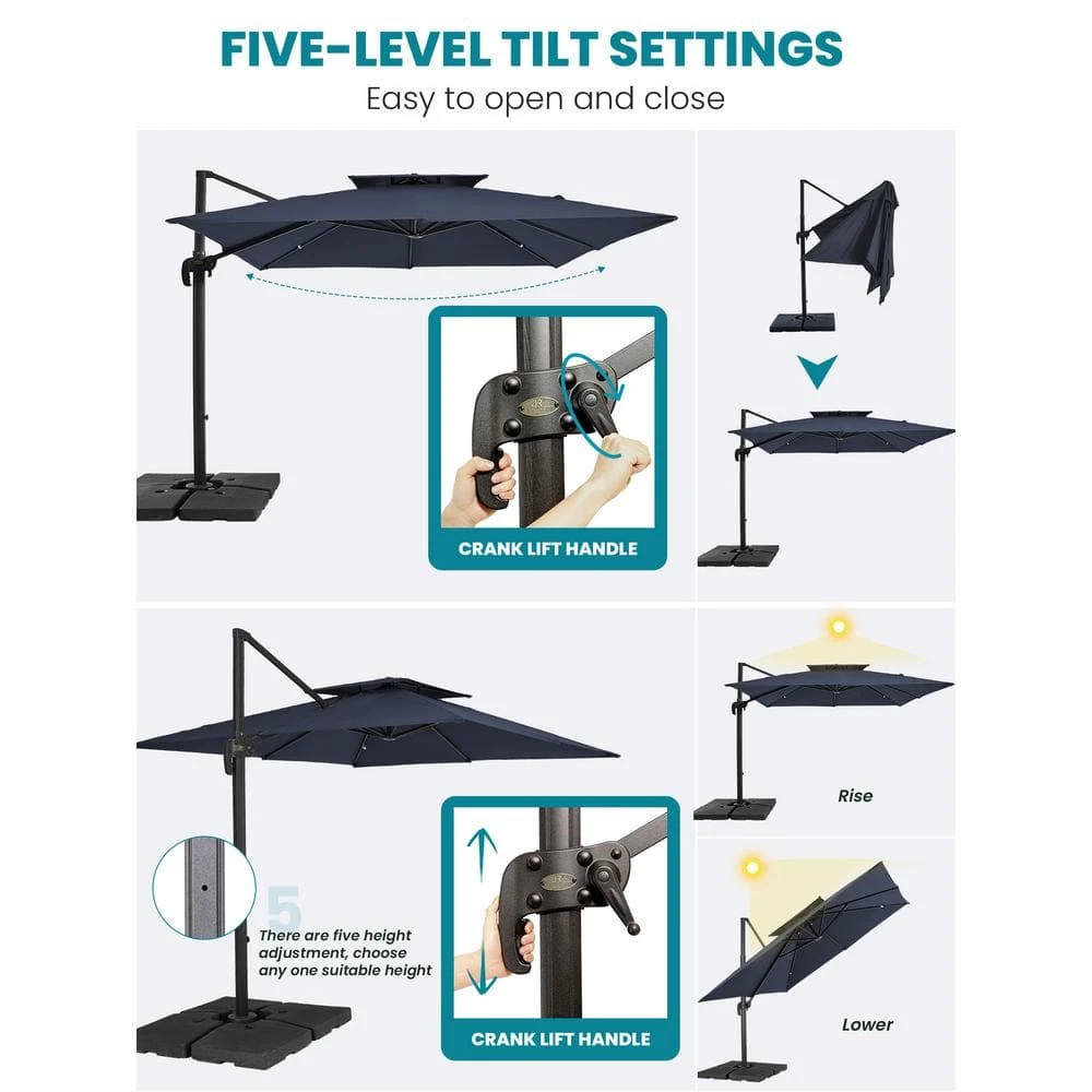 - CRANK AND TILT SYSTEM DESIGN – This patio cantilever umbrellas is easy to opening and closing with it’s crank and tilt system. Convenient slide and lock operation system offers multiple angles of shading that helps you keep the sun out from many angles and creates cool and comfortable environment for your family