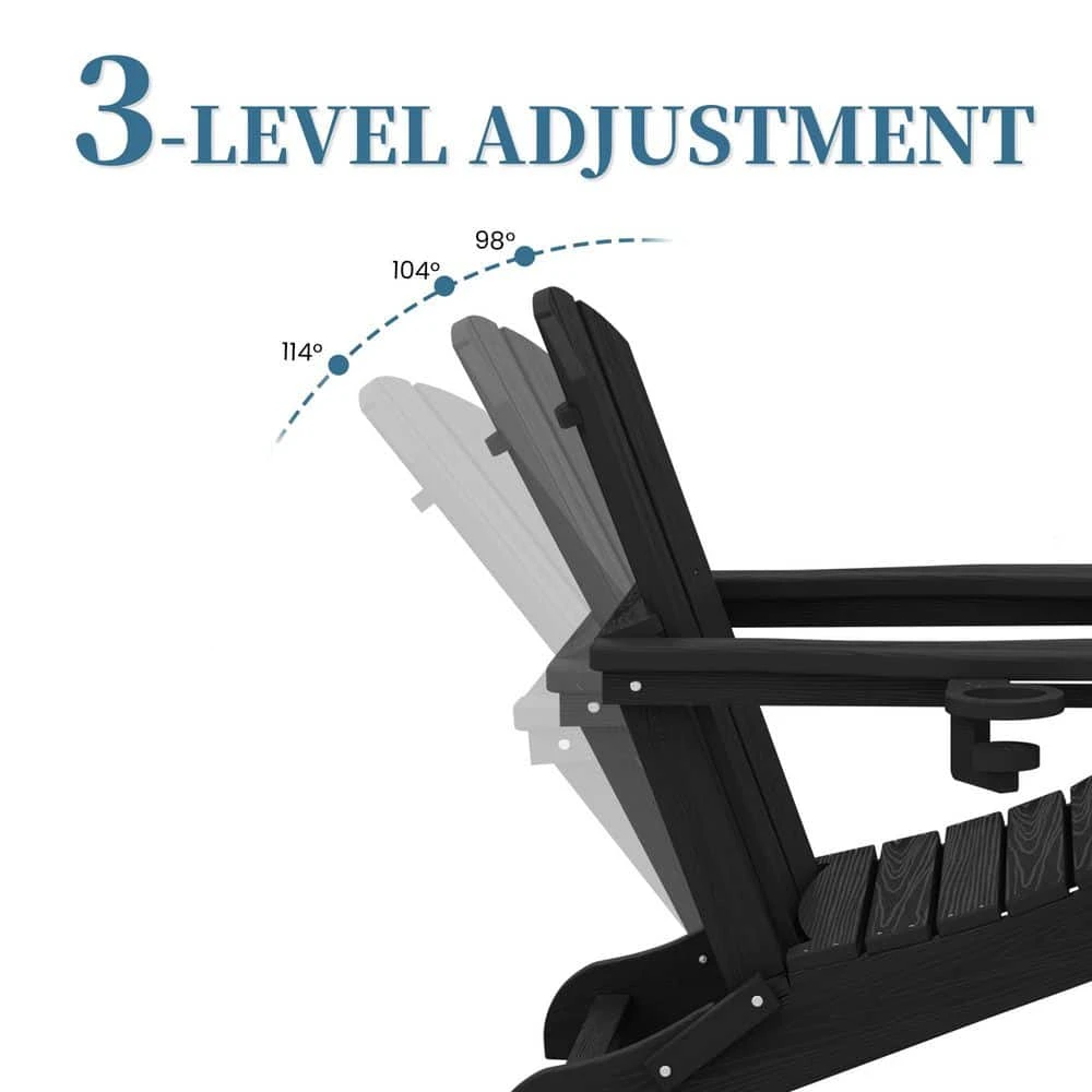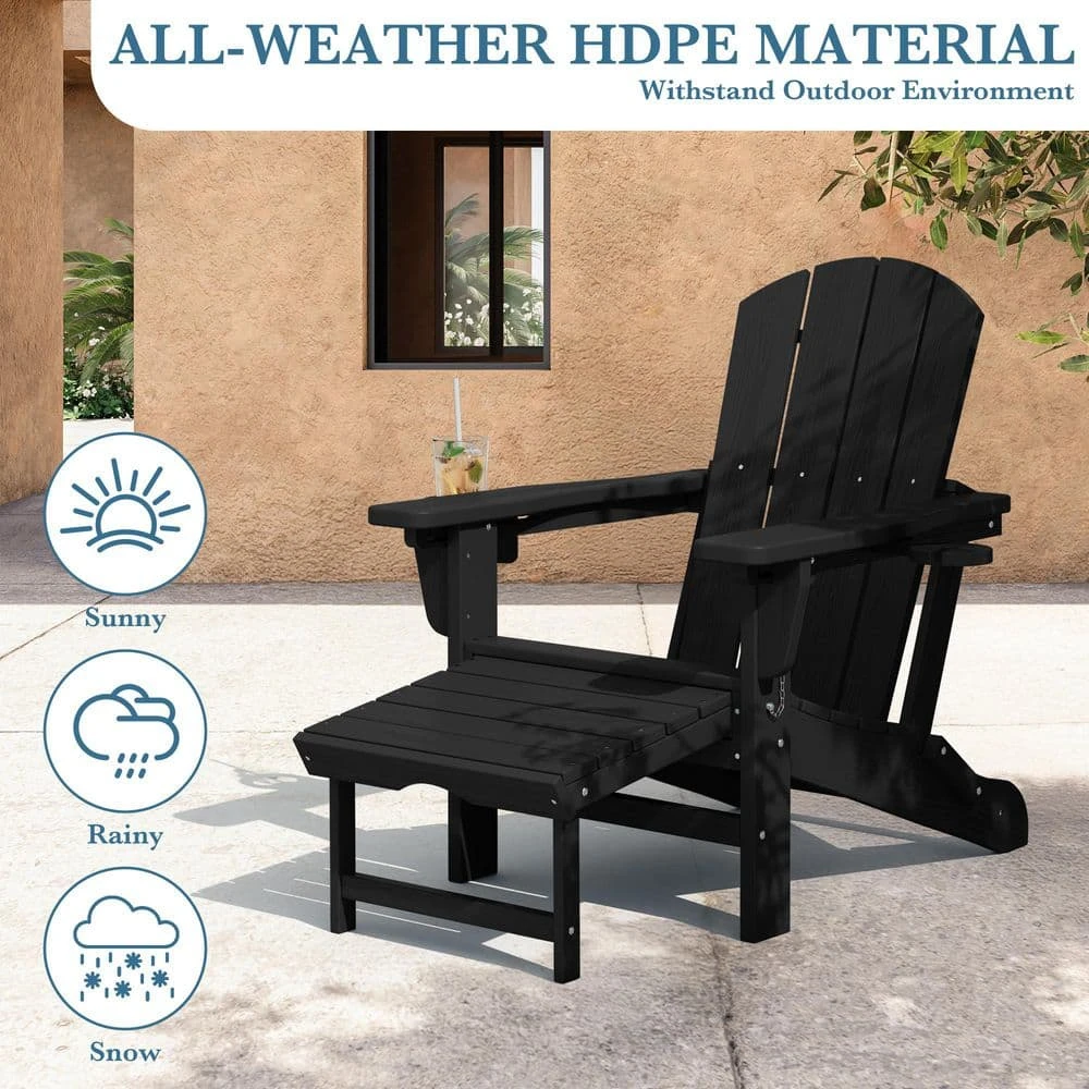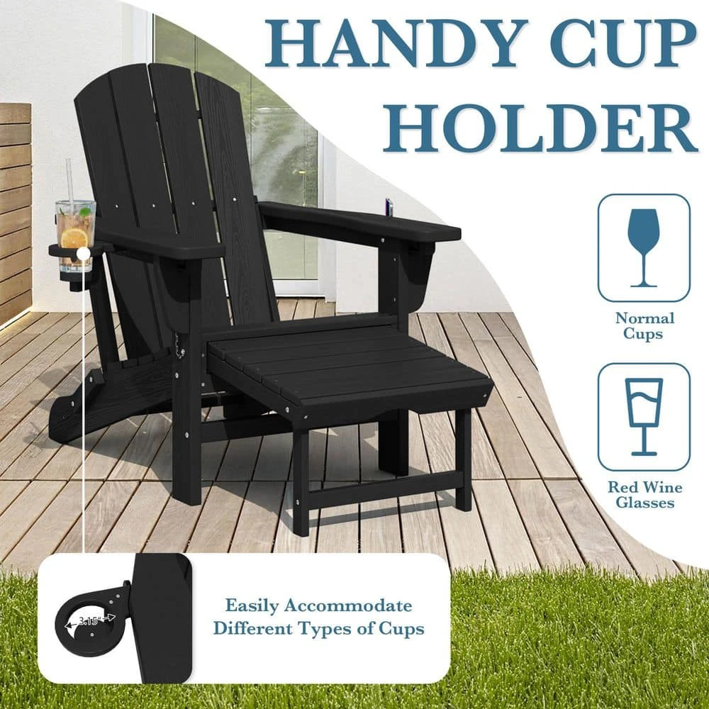 3-Level Adjustable Patio Folding Plastic Adirondack Chair With Retractable Ottoman, Cup And Phone Holders In Black