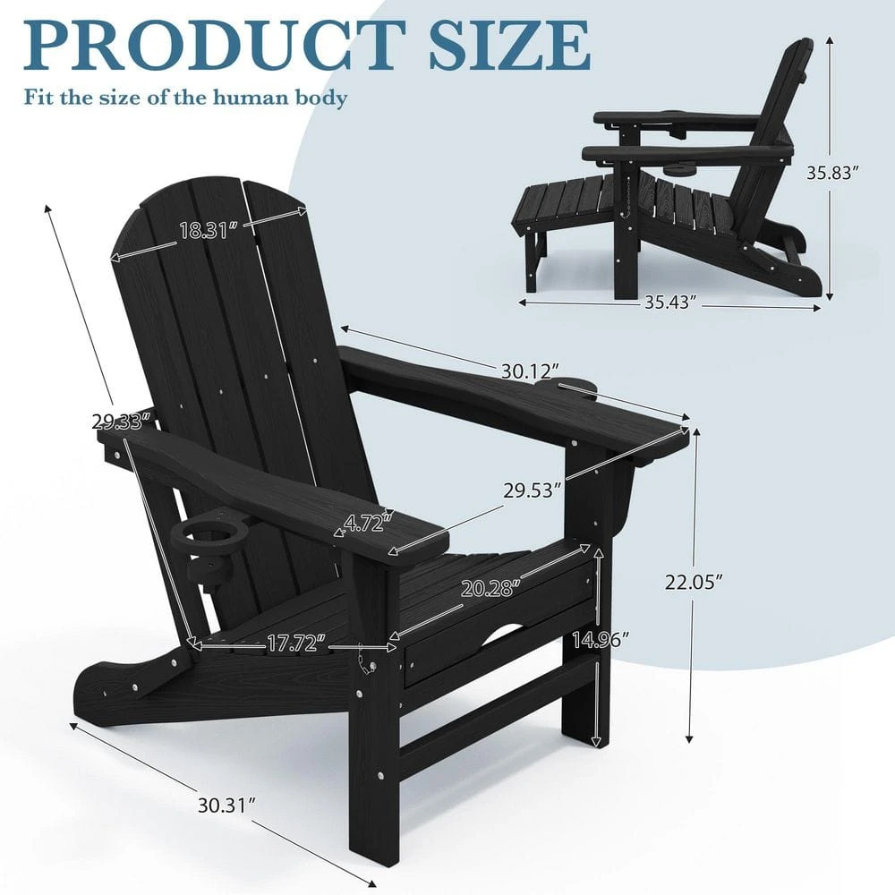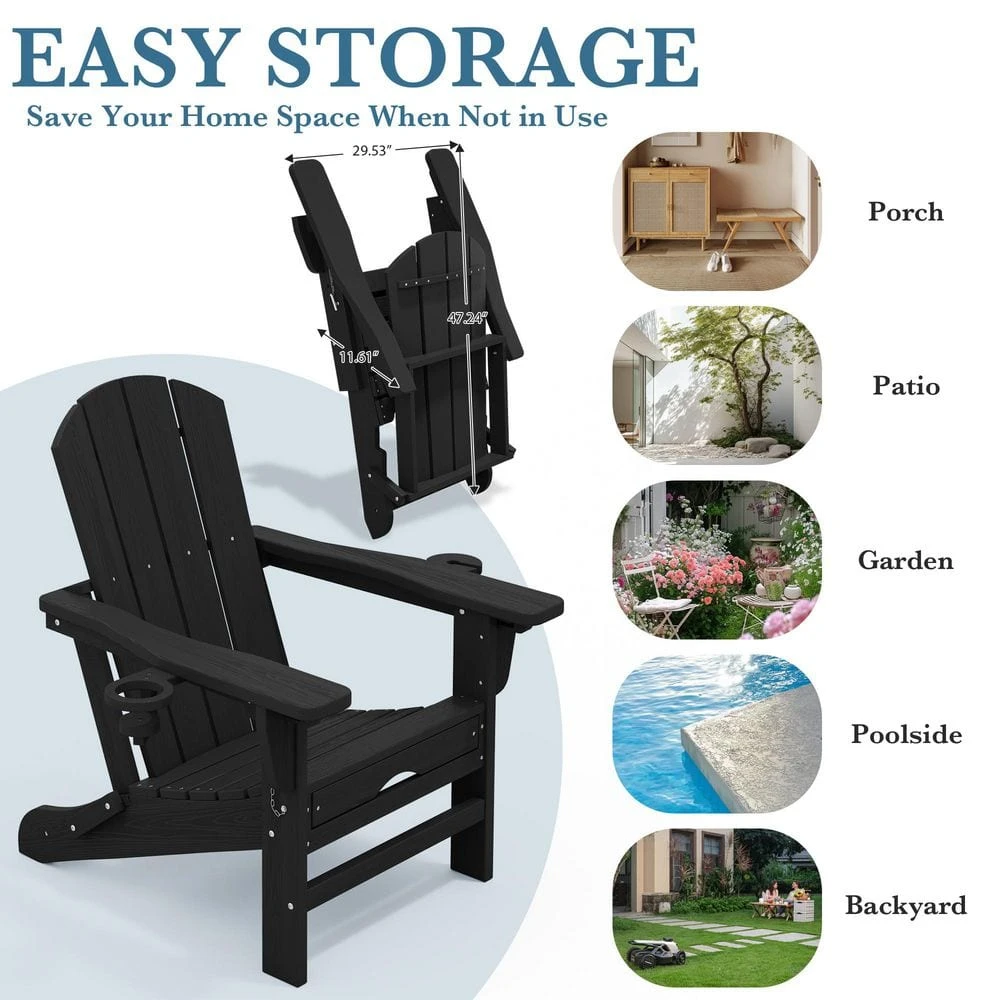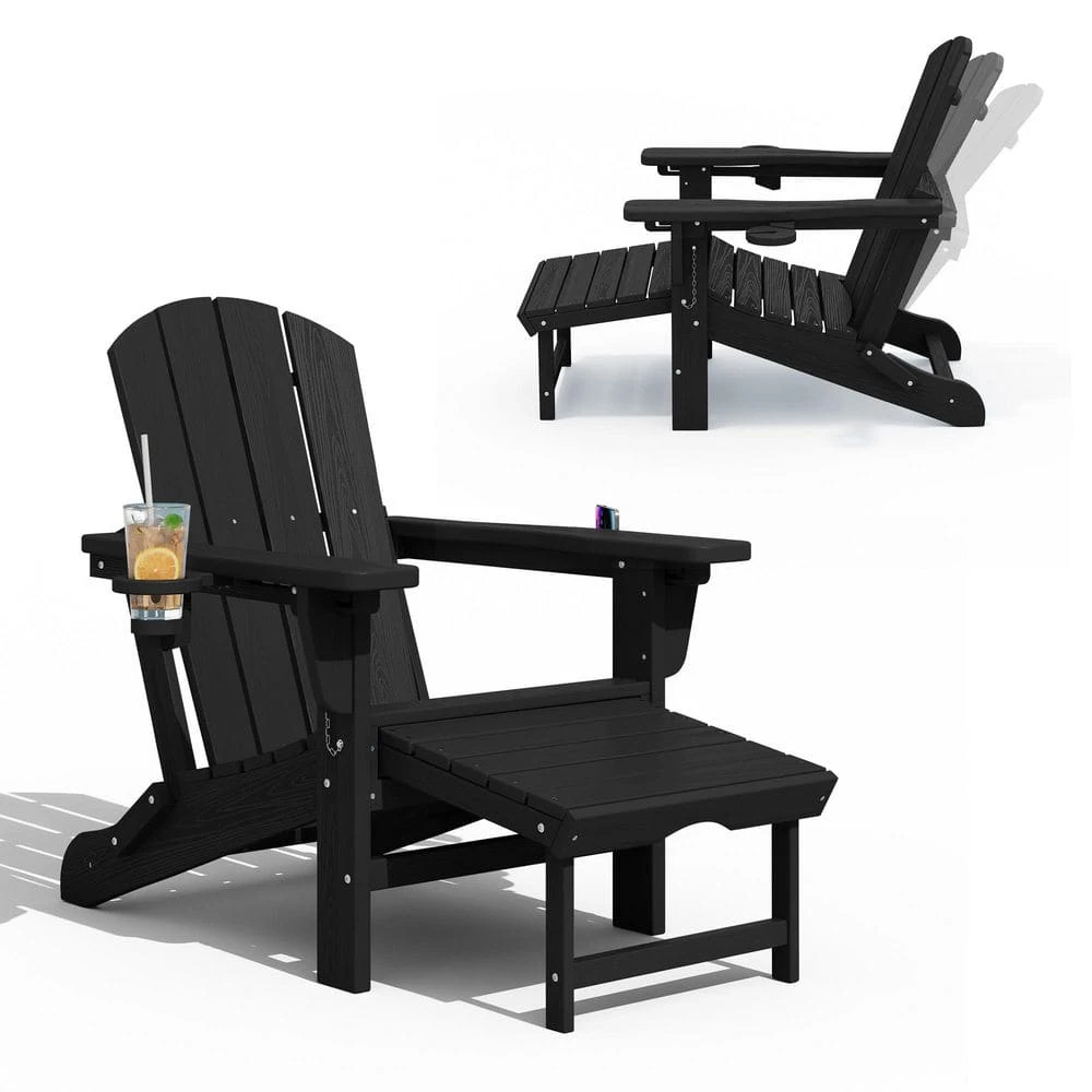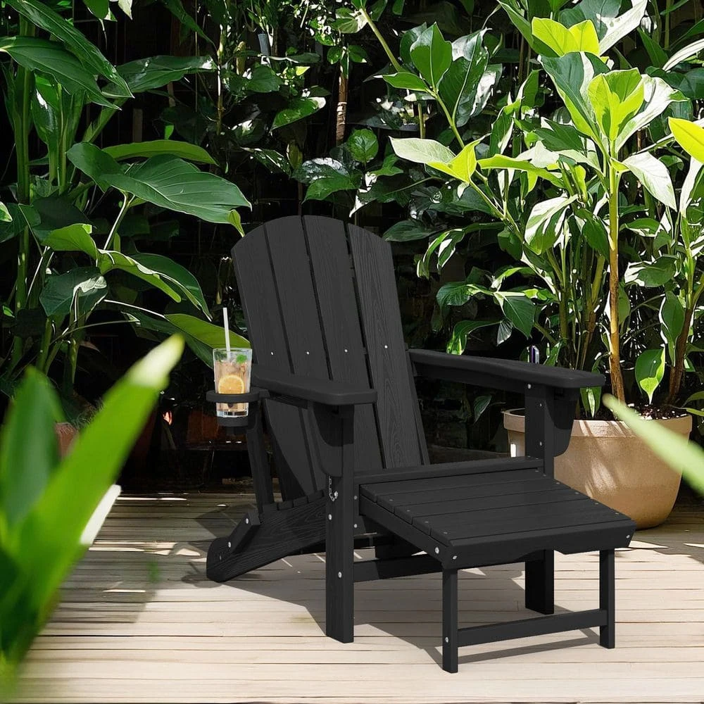 3-Level Adjustable Patio Folding Plastic Adirondack Chair With Retractable Ottoman, Cup And Phone Holders In Black
