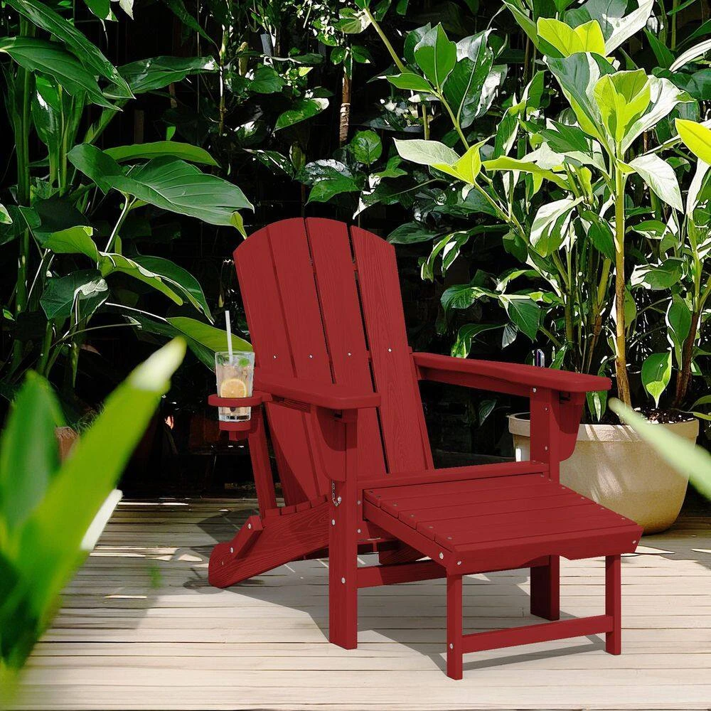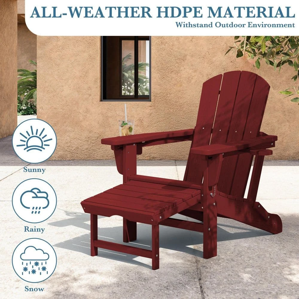 3-Level Adjustable Patio Folding Plastic Adirondack Chair With Retractable Ottoman, Cup And Phone Holders In Dark Red