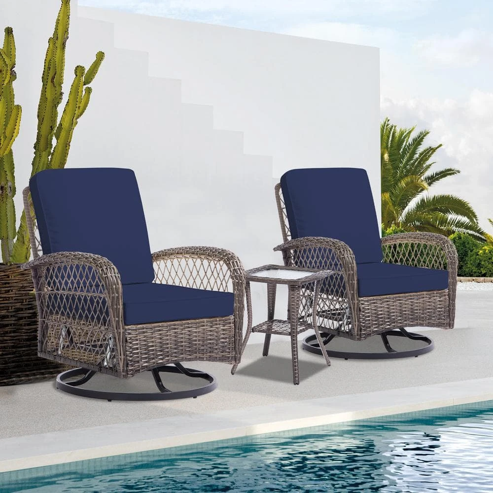 The outdoor swivel rocker set includes 2 wicker swivel rocker chairs and 1 tempered glass top side table. Each chair has a weight capacity of 265 lbs. and the side table has a weight capacity of 66 lbs. The natural color wicker with beige cushions in a simple and premium tone is perfect for decorating your patio, porch, deck, sunroom, and other outdoor spaces.