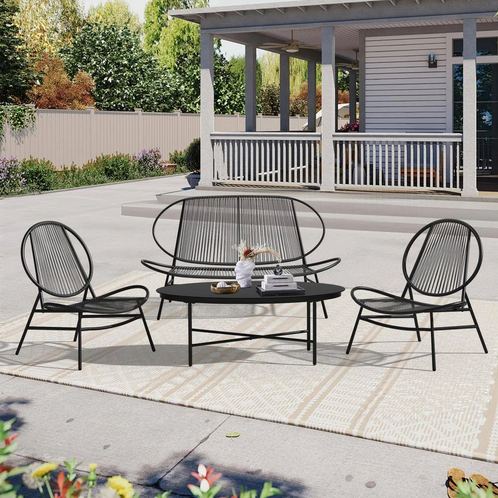 Simple yet elegant design makes this 4-piece bistro set perfect for any outdoor and indoor setting. You can sit on the front porch and enjoy afternoon tea or chat with friends in your own backyard. Made of cast aluminum, it features a unique design and black finish for a vintage look that will suit any home.