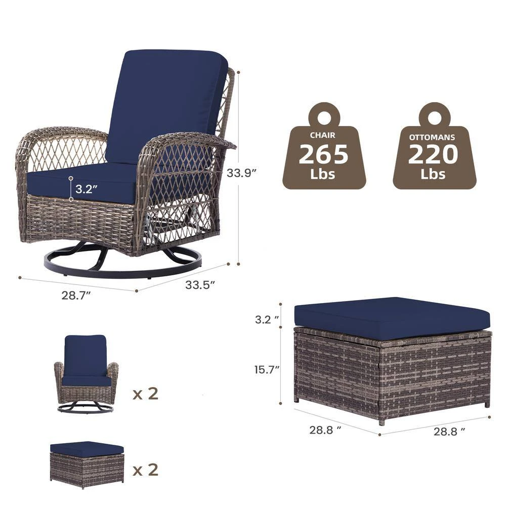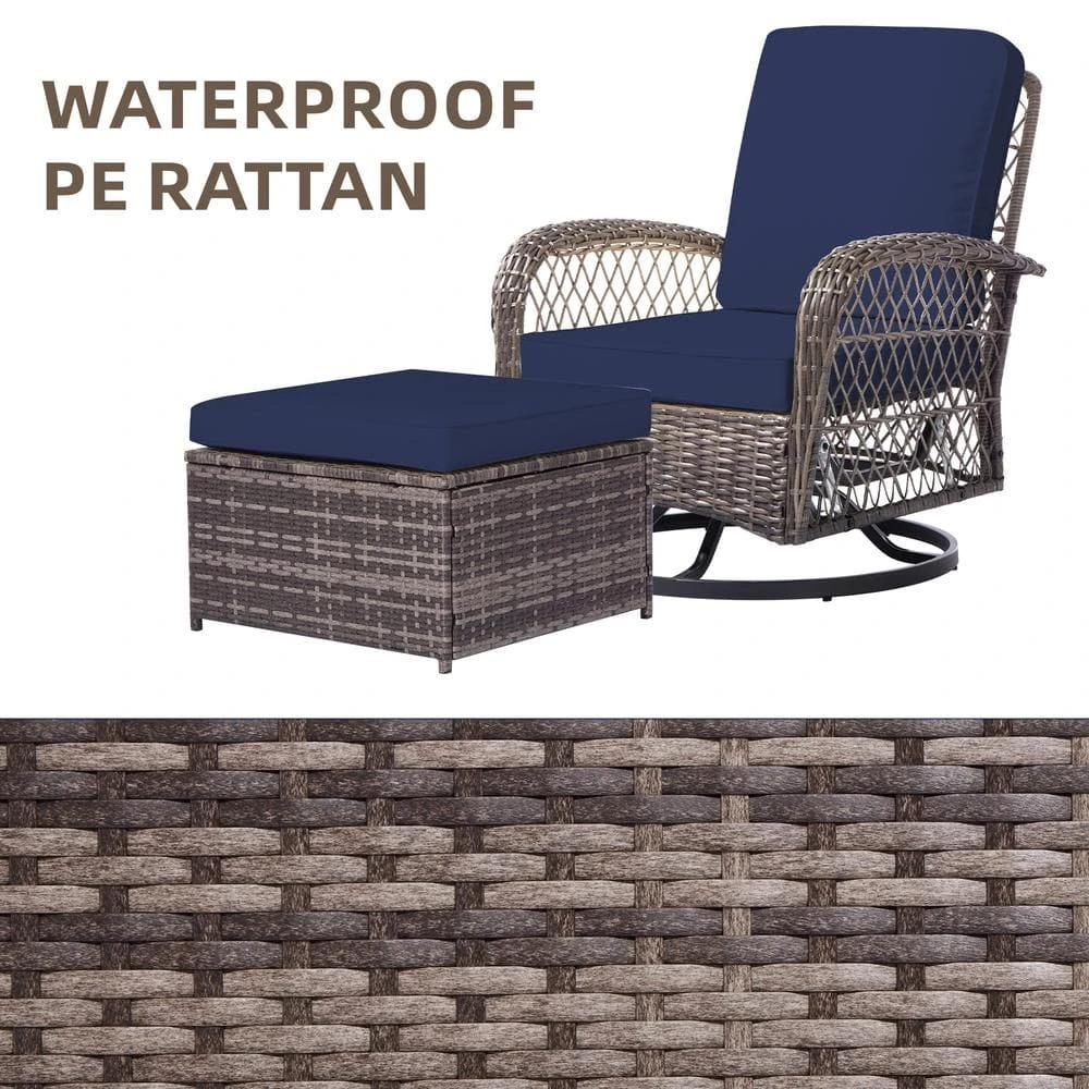4-Piece Navy Patio Wicker Bistro Furniture Set With 2 Cushioned Swivel Outdoor Rocking Chair With Cushion And 2 Ottomans