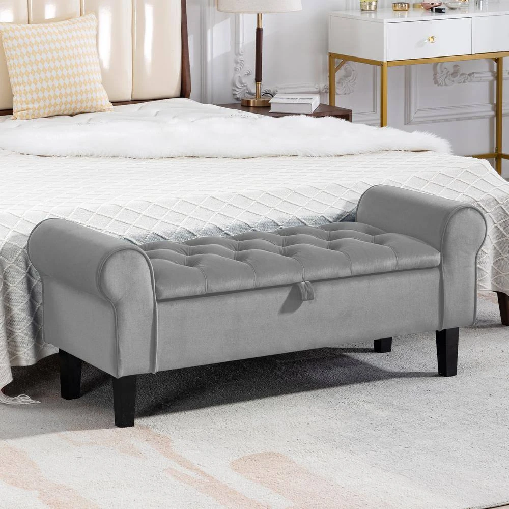 Organize your home with an elegant companion and welcome your guests with exquisite splendor. Perfect for your living room, foyer or bedroom, this footrest stool boasts convenient storage space while creating an elegant ambiance for your decor. Complete with rolled arms, lovely summary tufting, and soft pressure hinges, this footstool is an ideal addition to any home, adding taste and function to your interior space. Tying your home together with its versatility and stunning looks, this footstool will impress for years to come.