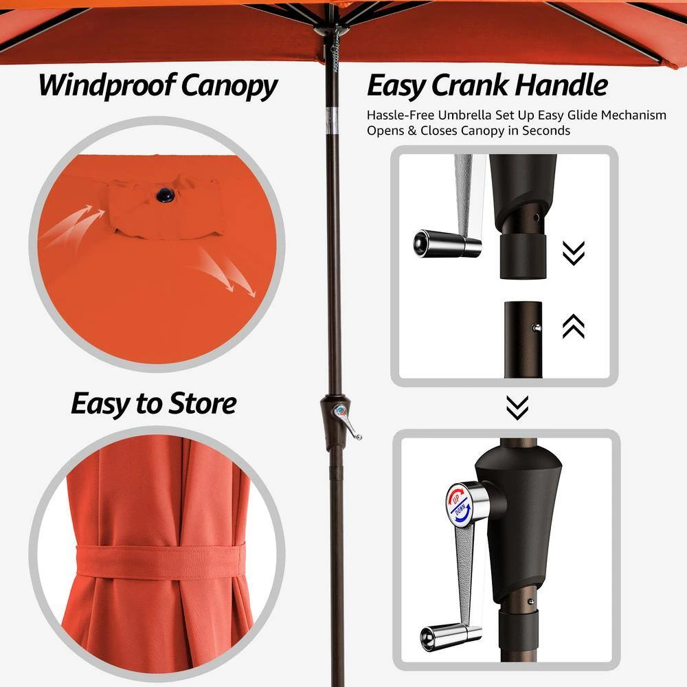 The 7.5 ft., square patio umbrella is made of high durability UV-resistant polyester fabric, which is waterproof, fade-resistant and rust-proof. And the crank system makes it easy to collapse. The function of tilt can satisfy your demand. Provide a perfect shade for your patio, garden, deck, backyard, pool and any other outdoor area.