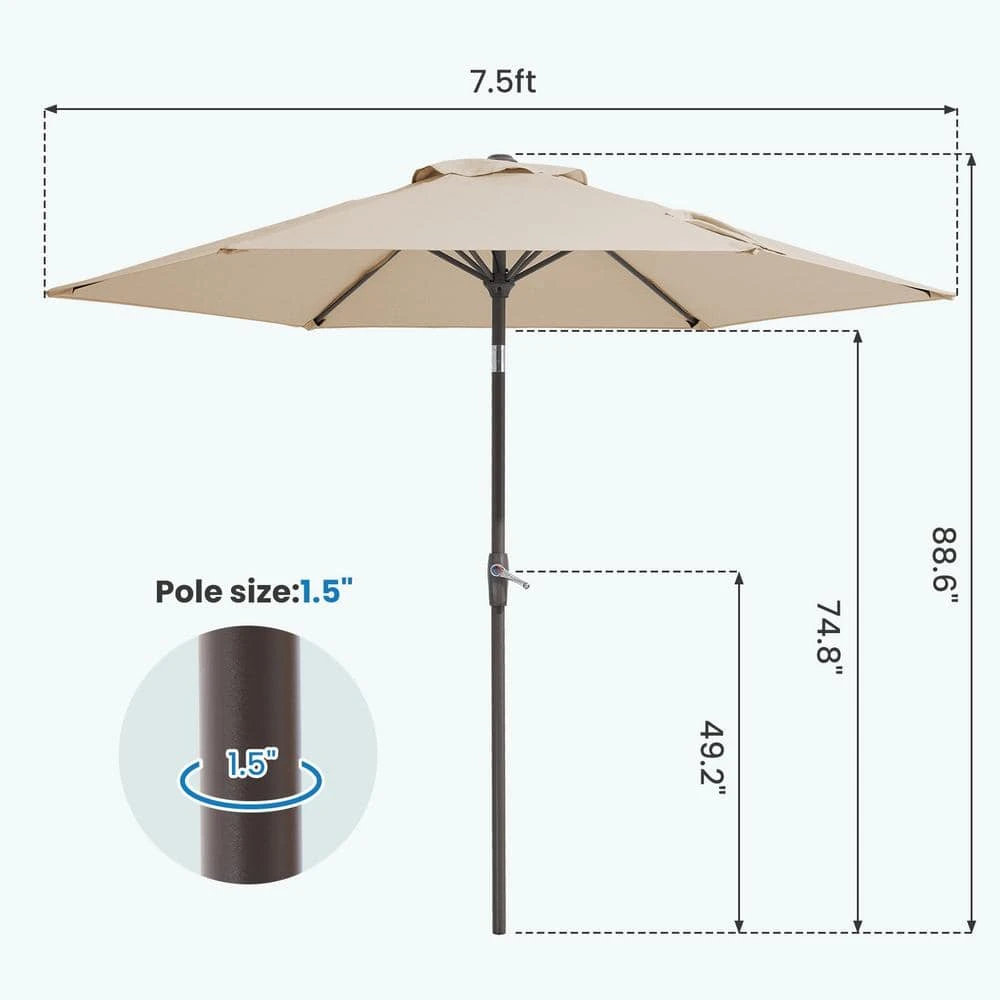 With exceptional quality 7.5 ft. patio umbrella to stay outdoor to enjoy nature. Its colorful, waterproof polyester fabric provides the function of sun protection. The weather-resistant steel pole has a convenient crank lift to manually tilt, so it can adjust the angle of this umbrella to suit your needs. Plus, it is great for patios, porches, lawns. For safety, use the umbrella only in conjunction with a dining table and heavy-duty umbrella base (sold separately). 2 tightening knobs on the base tightly secure your umbrella pole and allow for use with a variety of pole diameters.
