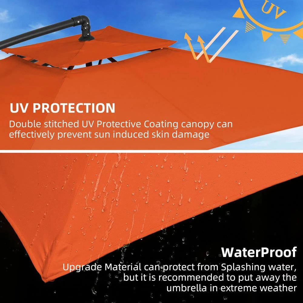 Get a new cantilever umbrella for your backyard or garden now. A wonderful solution for any leisure time outside under bright Sunshine. The double-deck design can provide you extra air ventilation and no worry about any Sunshine leak, the top deck is bigger than the little window on the top of the umbrella. Even this umbrella can be used for commercial use, put outside of your store for those customers who want to sit outside the room. Please Note: Stand included(Crossbar), sandbag included as well(need to fill by yourself).