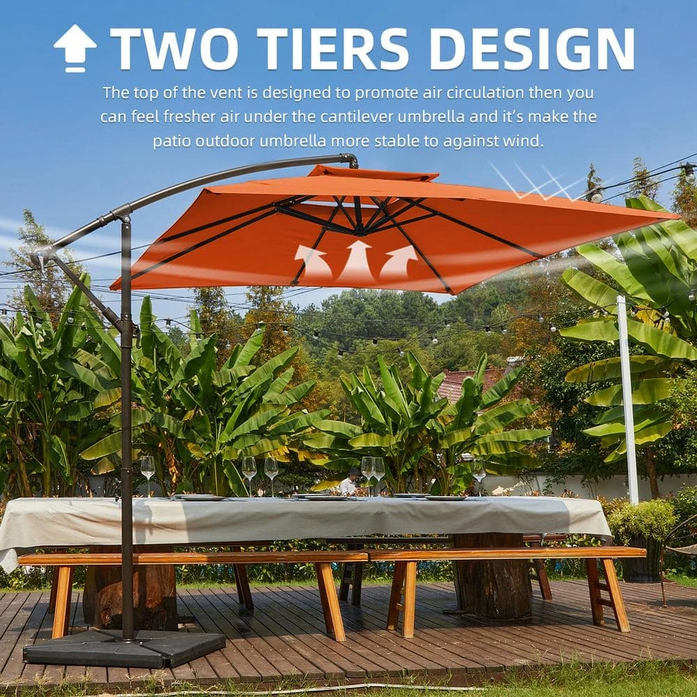 - Robust and stable: this cantilever patio umbrella is equipped with powder coated aluminum rod, which is easy to store and lighter than steel rod. the handle and top joint are also upgraded and reinforced to provide excellent stable support, it is an ideal material for outdoor umbrella, in addition, the 8 strong ribs make it more durable in a sudden gust and rust resistance, 2 tier vented top which is conducive to air circulation and reducing sultry