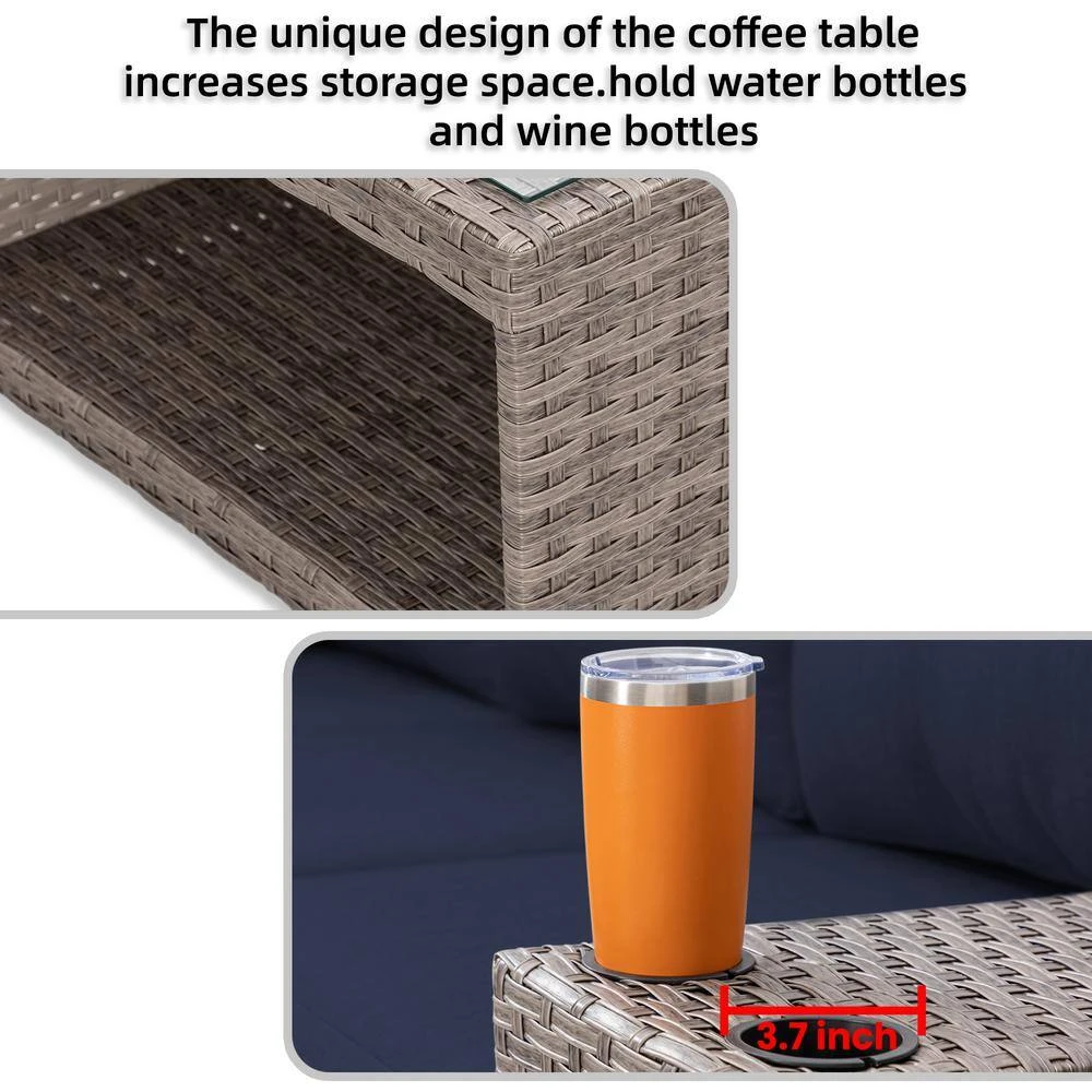 Crafted with thick PE rattan wicker weaving reinforced with light-weight aluminum, this 9-piece patio set lasts through changing weather – and changing trends. Designed with versatility in mind, each set comes with 2 armless sofas,1 left arm sofa,1 right arm sofa,2 single chairs,2 ottomans, and 1 coffee table. and they’re topped with 6 in. thick foam-filled polyester cushions with removable olefin fabric cushion covers. And the table is topped with a tempered glass surface that’s perfect for placing down drinks, while also being easy to clean. It is worth mentioning that the coffee table has storage and there’s no assembly required. (TIPS: The small cushions are not included).