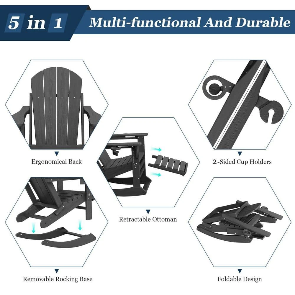 - 4 -in-1 multifunctional folding rocking chair: our folding rocking chair is a combination of a rocking chair and a folding adirondack chair with retractable ottoman, featuring a folding design, a removable rocking base, a retractable ottoma and 2 cup holders. it meets your diversified needs in different occasions, becoming an indispensable leisure companion in your life