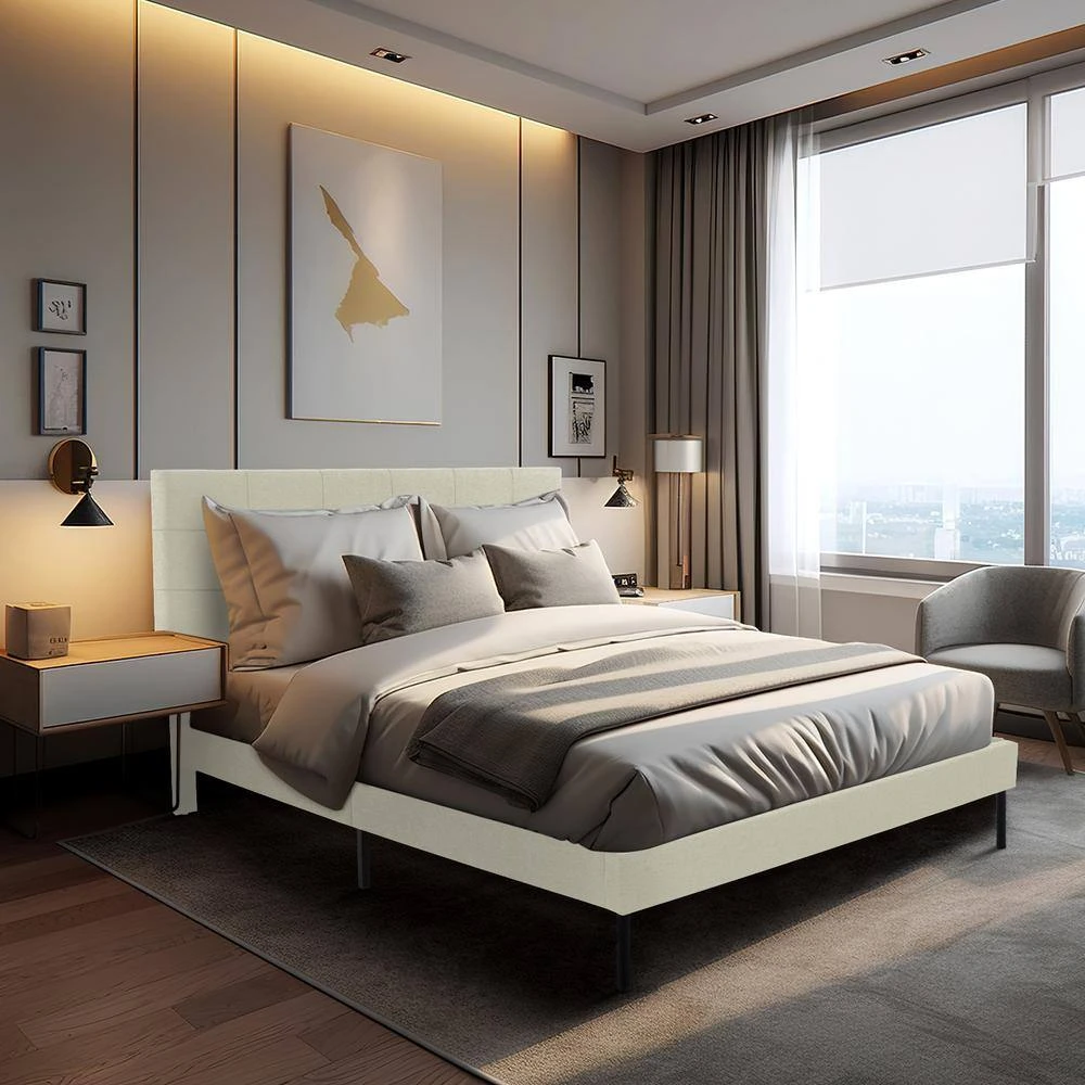 Alex Beige Twin Upholstered Platform Bed Frame With Headboard