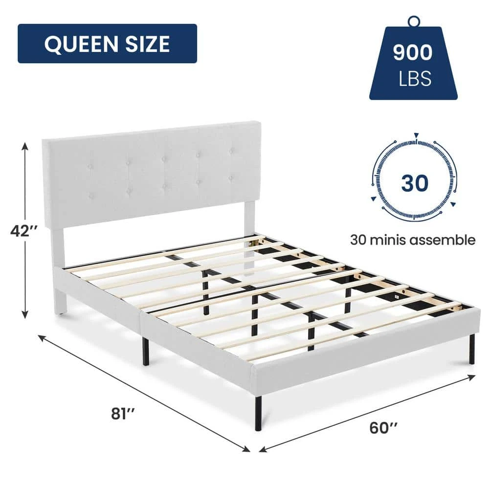 This queen-size platform bed makes a great addition to your bedroom. Sophisticated upholstered finishes paired with a classic tufted headboard add decorative appeal. Thick side rails and evenly spaced sturdy wooden slats support the mattress, eliminating the need for a box spring. The metal frame, high weight capacity of 900 pounds, and sturdy bed legs make it more stable. It provides some ground clearance for easy cleaning.