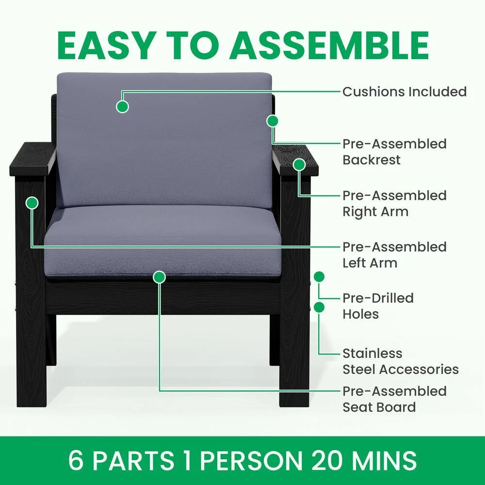 Transform your outdoor space with the Conversation Set. It includes a loveseat, 2-accent chairs, and a convenient coffee table, all designed for comfort and durability. The HDPE construction ensures weather resistance, while the cushions offer ultimate relaxation. This set is also easy to assemble, perfect for your patio, garden, or balcony. Whether hosting guests or enjoying a quiet afternoon, our conversation set provides both elegance and functionality to elevate your outdoor experience.