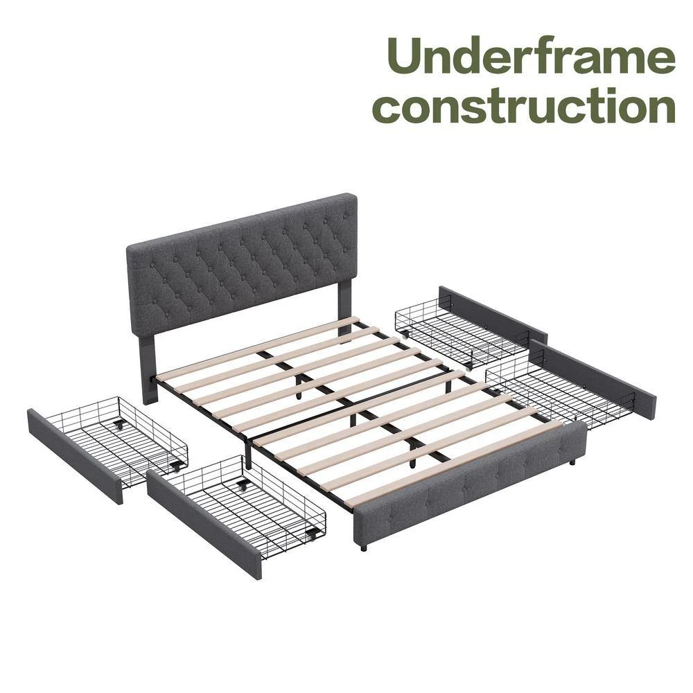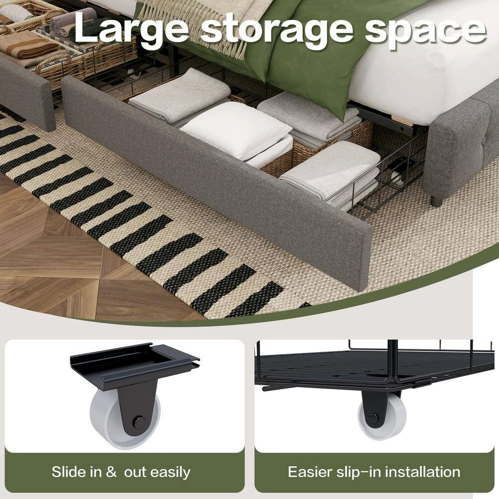 - Convenient storage solution: Say goodbye to clutter and hello to a tidy bedroom. Our queen storage bed frame comes with four spacious under-bed storage drawers on wheels. Ideal for organising out-of-season clothes, quilts and smaller items, these drawers ensure your belongings are neatly stored away. We also supply 4 matching drawer liners to prevent tipping and keep everything in place to protect your belongings.