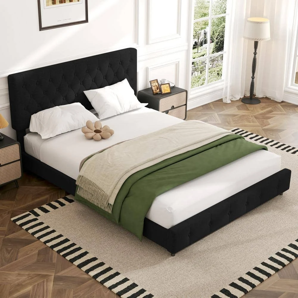 Black Full Linen Upholstered Storage Platform Bed Frame With Headboard