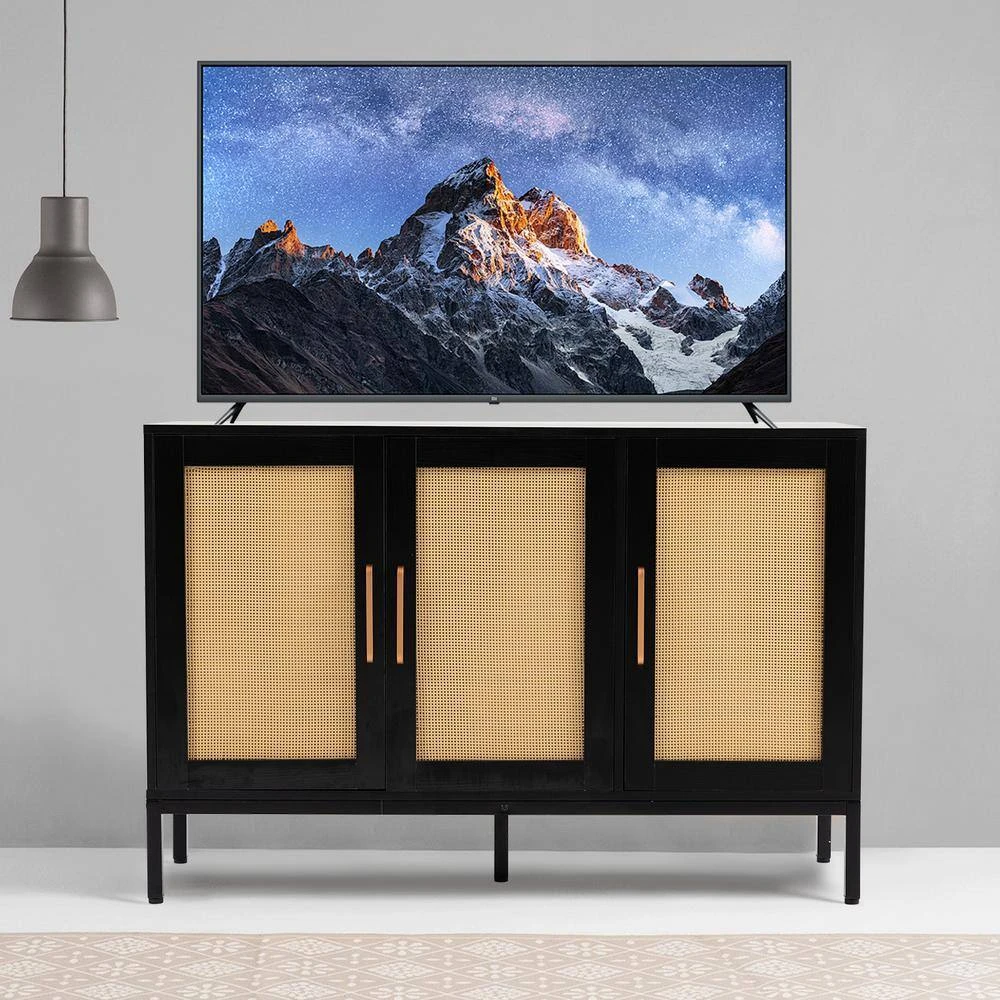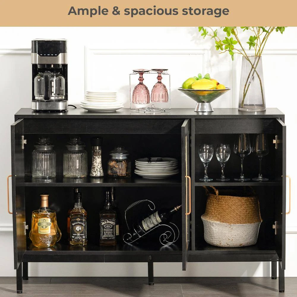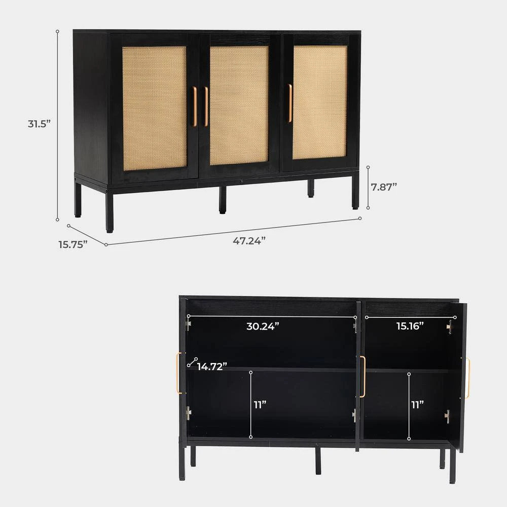 With its sleek, space-saving design, this sideboard will add character to your room in minutes. The rattan-decorated cabinet door combines beauty and practicality. It is made of natural rattan with hand-woven technique, natural rattan not only has the effect of absorbing moisture and heat, but also brings perfect visual effect to add charm to your home. It is more substantial than ordinary storage sideboards, increasing the value of your purchase. Extra-large storage space with built-in shelves and wide tabletop maximizes your storage space. Our storage sideboards are made of quality wood and metal legs for long-life. The storage sideboard is easy to store and organize your room. The 3-door cabinet design provides plenty of hidden storage space. You can place it in your dining room for dishes, in your living room for your record player or in your entryway to greet guests.
