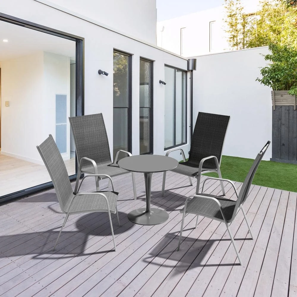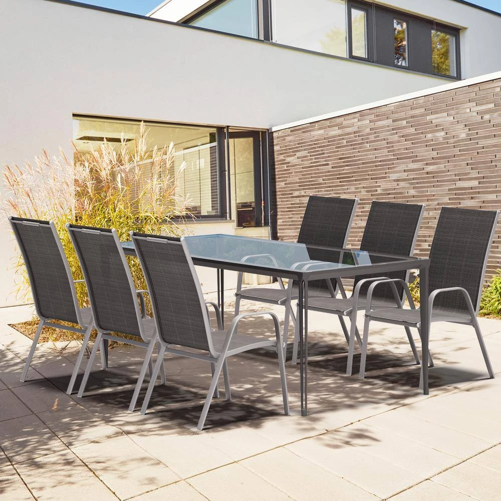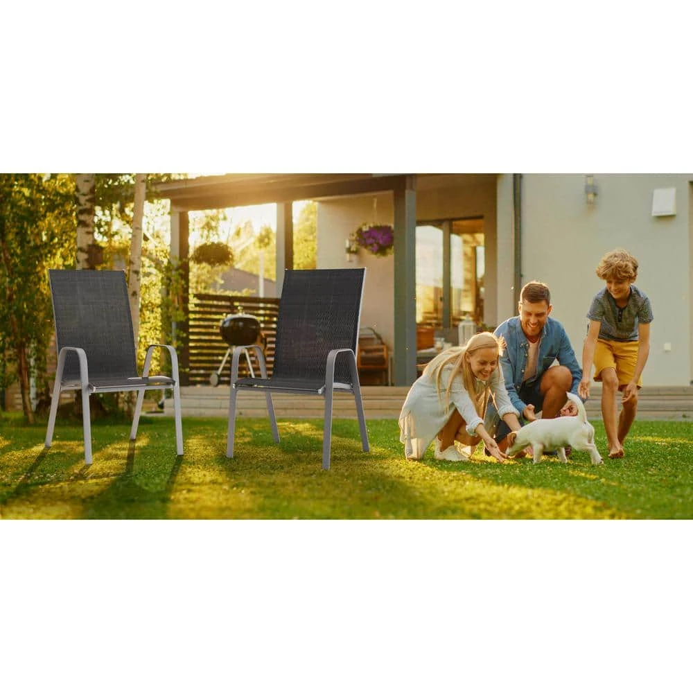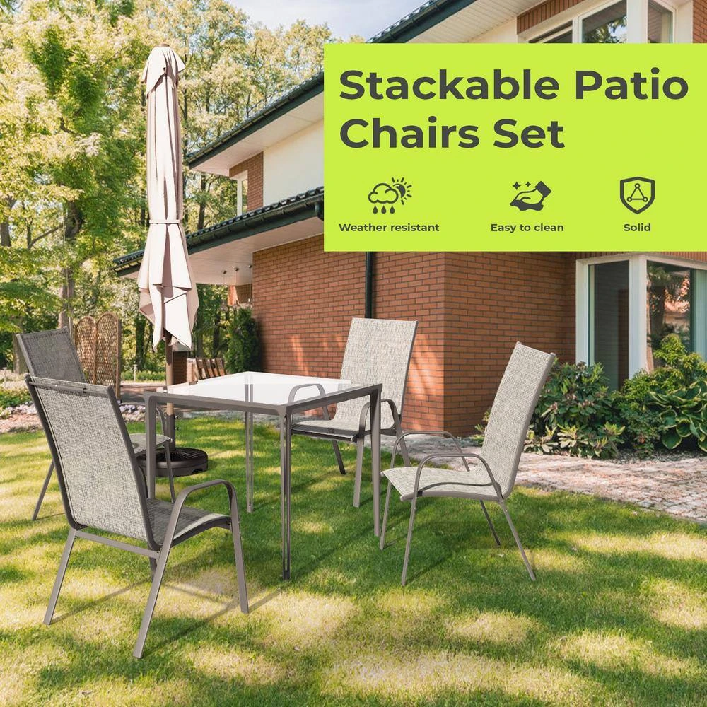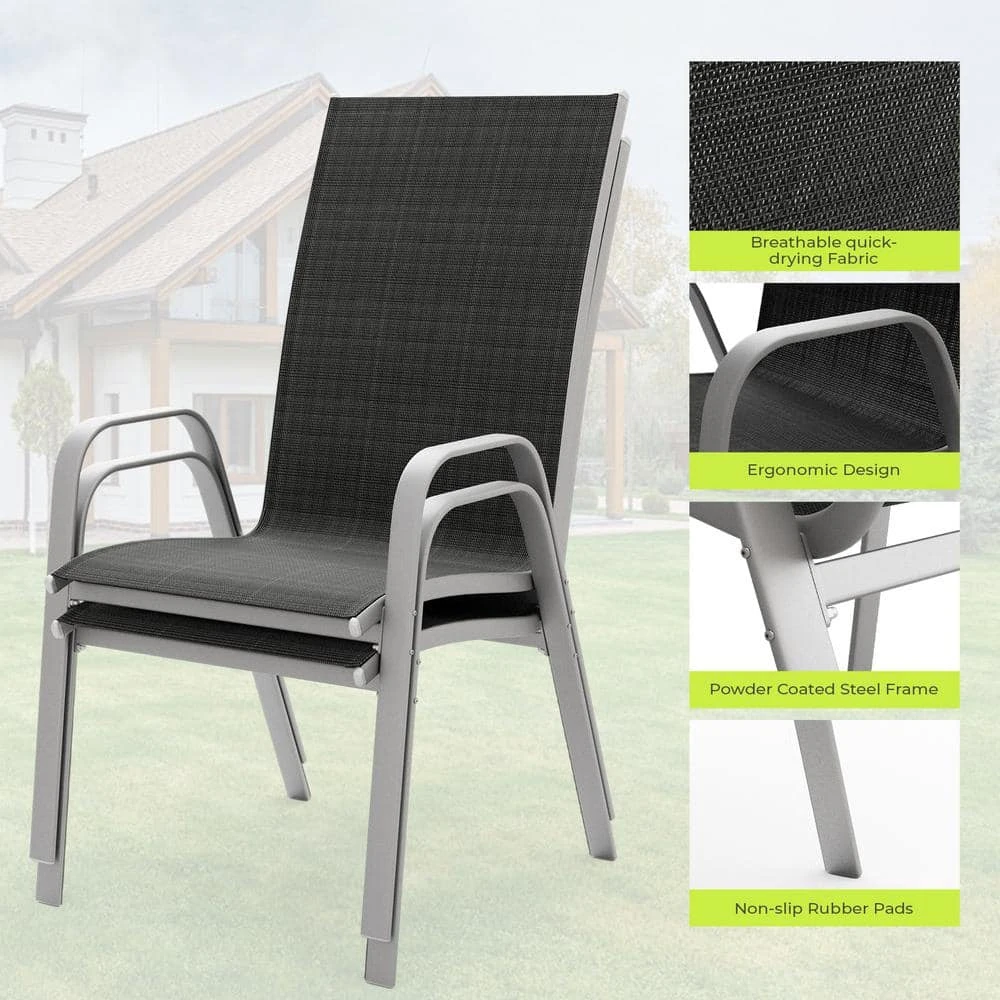 These patio chairs are made of maximum flexibility for you to relax and enjoy the outdoor time with family and friends. The selected fabric is breathable, quick-drying, wear-resistant and durable, which will withstand outdoor conditions better. And the frame is made of sturdy and rustproof steel for strong loading capacity. These patio dining chairs can be stacked in a vertical shape that is designed for space-saving. And easy to move here to there since lightweight design. With incline and high back and curved armrests, this outdoor dining chairs support your body well and relax your arms. And seat area is wide enough for most people. The height from the ground to seat is 16.93 in., so these patio chairs match most outdoor dining table (not included) perfectly. Enhance your dream garden with this comfortable dining set. Note: Please do not tighten all the screws until all the holes are aligned.