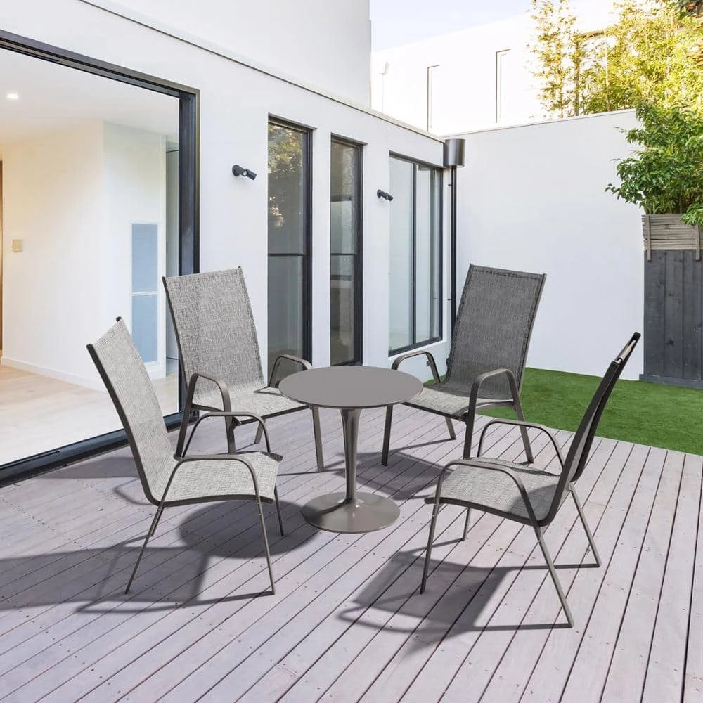 These patio chairs are made of maximum flexibility for you to relax and enjoy the outdoor time with family and friends. The selected fabric is breathable, quick-drying, wear-resistant and durable, which will withstand outdoor conditions better. And the frame is made of sturdy and rustproof steel for strong loading capacity. These patio dining chairs can be stacked in a vertical shape that is designed for space-saving. And easy to move here to there since lightweight design. With incline and high back and curved armrests, this outdoor dining chairs support your body well and relax your arms. And seat area is wide enough for most people. The height from the ground to seat is 16.93 in., so these patio chairs match most outdoor dining table (not included) perfectly. Enhance your dream garden with this comfortable dining set. Note: Please do not tighten all the screws until all the holes are aligned.