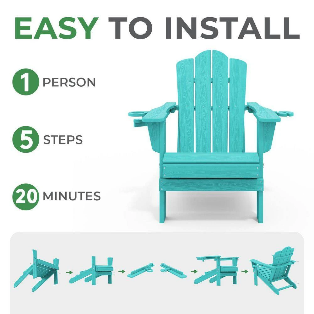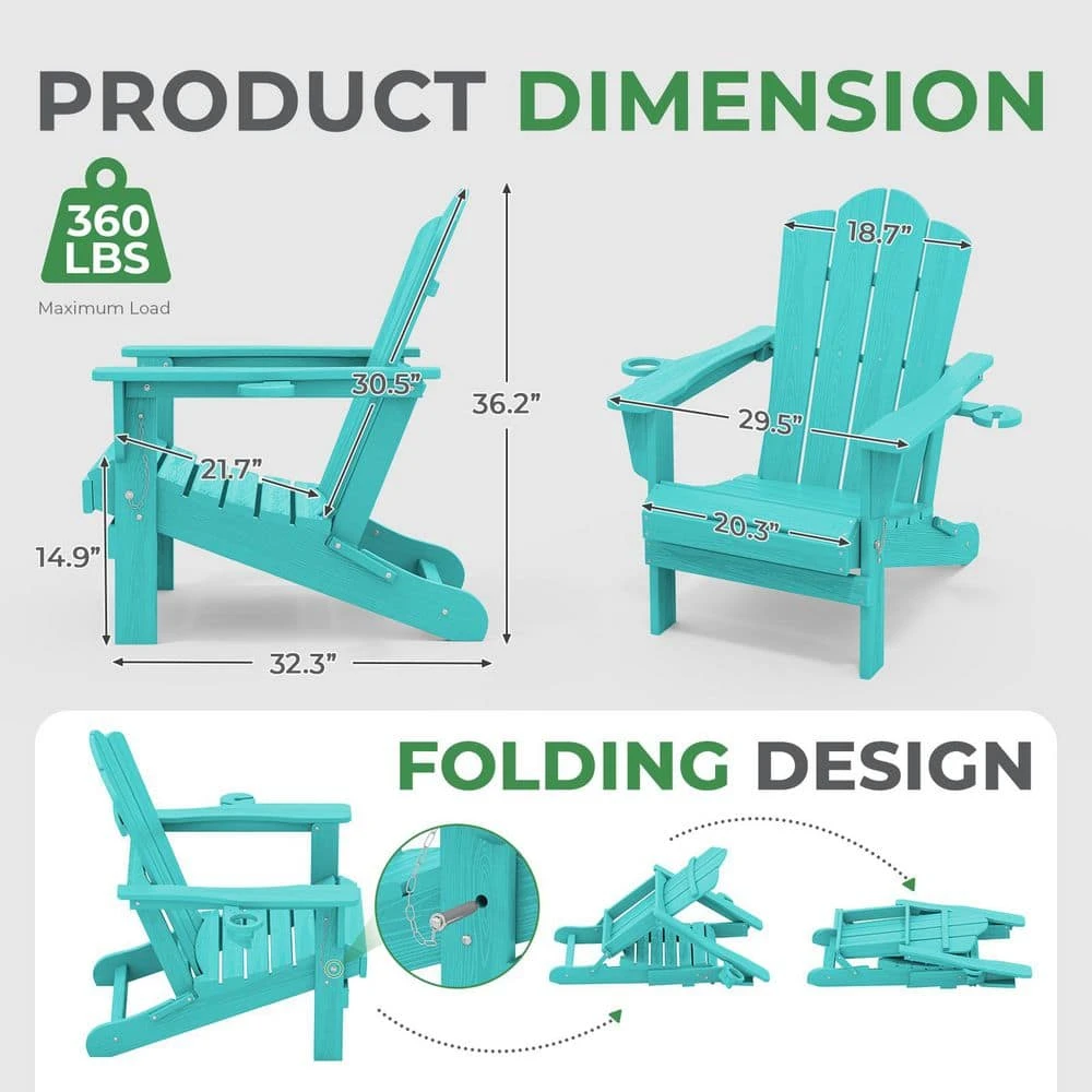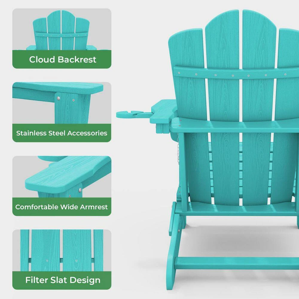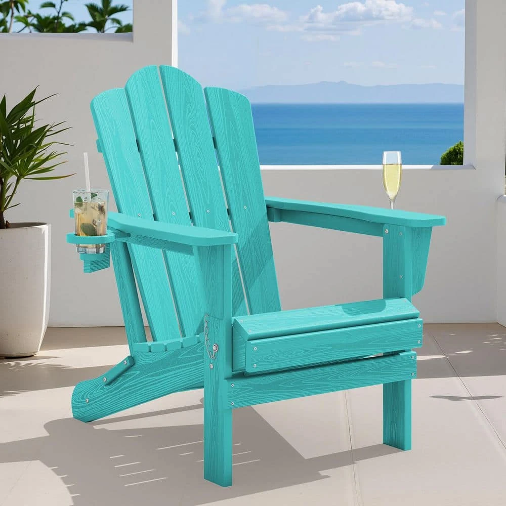 Classic Outdoor HDPE Folding Plastic Adirondack Chair With 2 Cup Holders In Aruba Blue (Set Of 1)