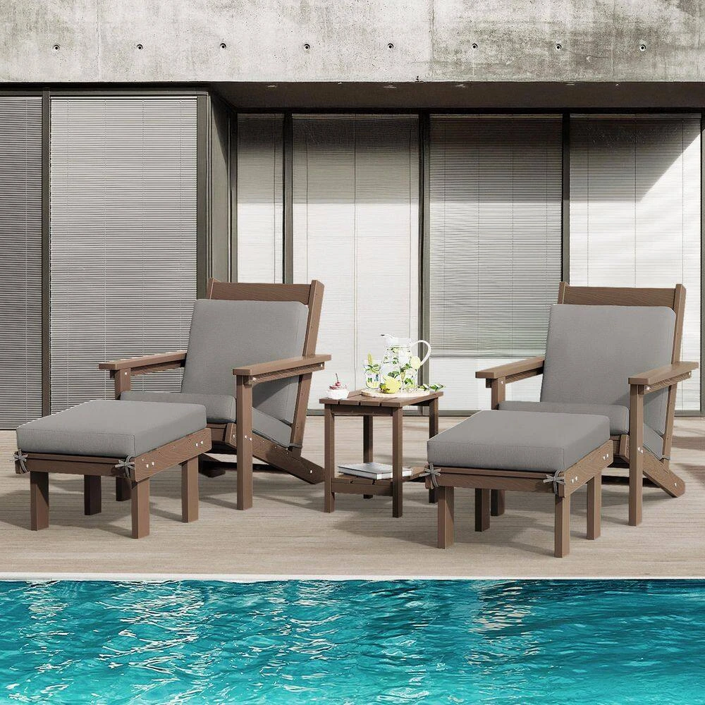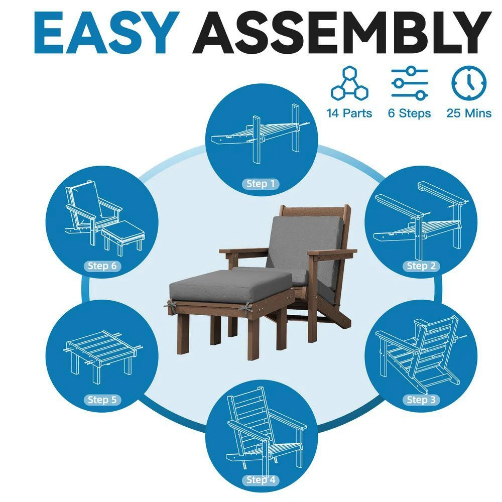 Classic Outdoor Patio HDPE Plastic Adirondack Chair With Footrest Ottoman In Brown
