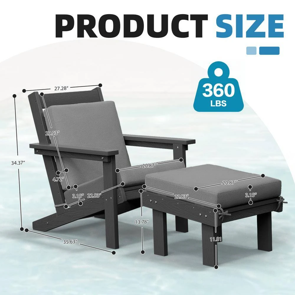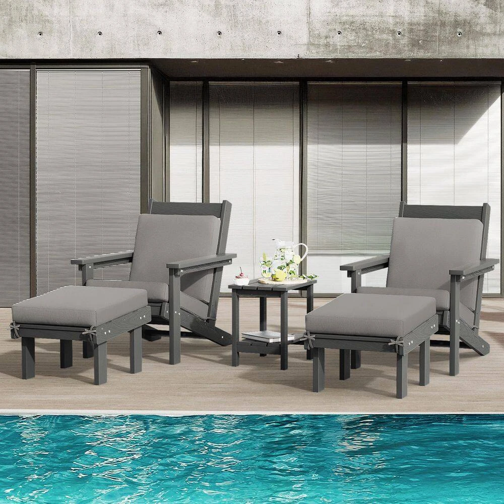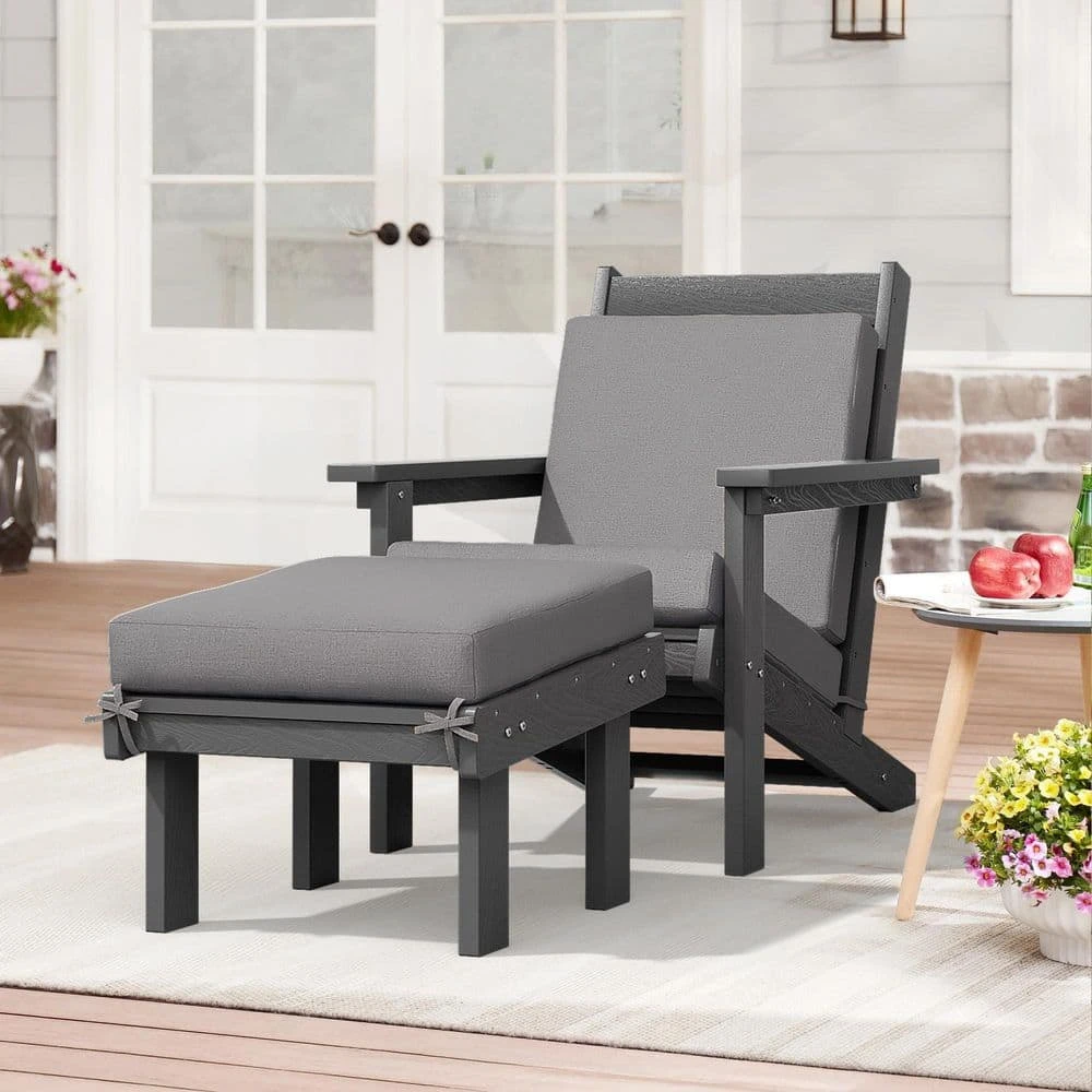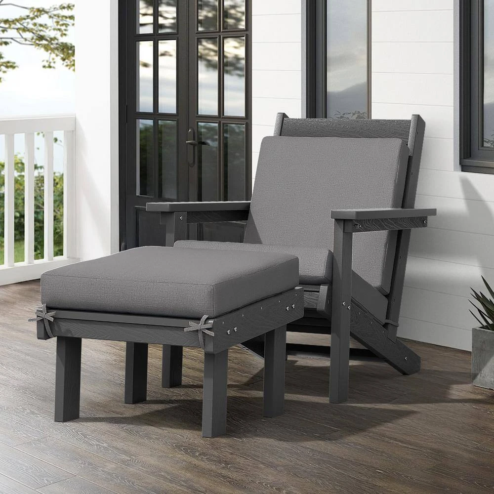 Classic Outdoor Patio HDPE Plastic Adirondack Chair With Footrest Ottoman In Gray