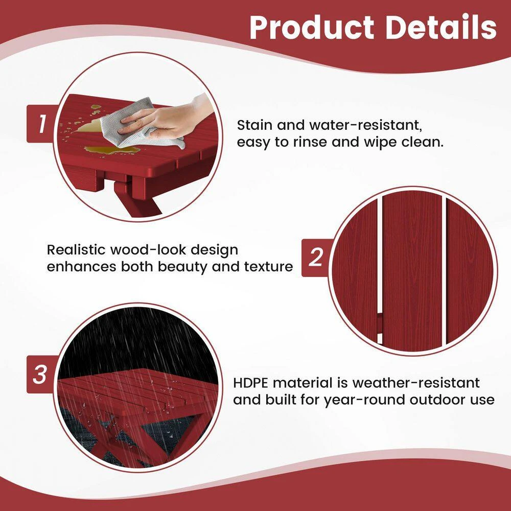 - Low maintenance: the smooth surface of the HDPE material is easy to clean and maintain, it resists stains and does not require painting or sealing, allowing you to enjoy your table without the hassle of upkeep
