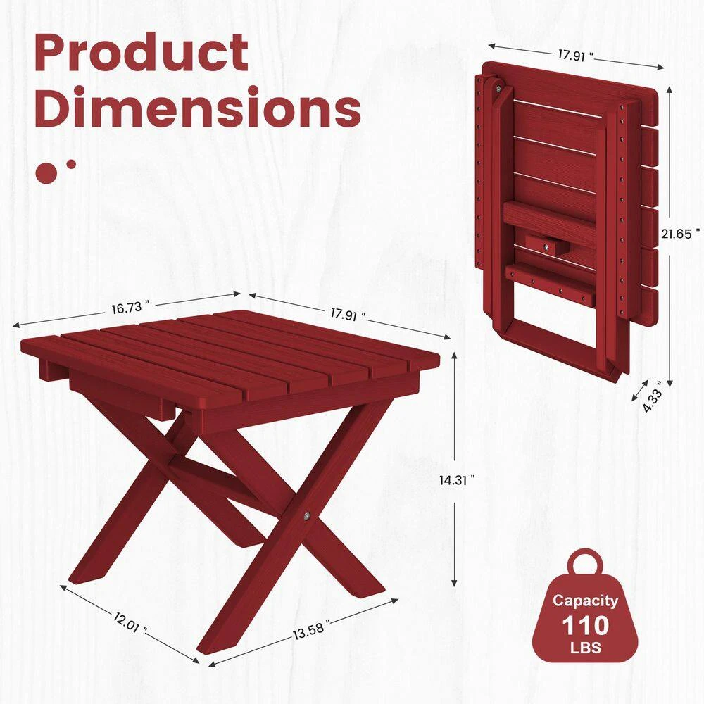 Compact, stylish, and built to last, this foldable HDPE patio end table is the perfect companion for your outdoor adventures or relaxing moments. Crafted from premium high-density polyethylene (HDPE), it boasts exceptional durability, standing strong against harsh weather, UV rays, and everyday wear. Whether you’re sipping coffee on your patio, enjoying a book in the garden, or hosting a backyard gathering, this table offers a reliable surface for your essentials. Its foldable design ensures effortless portability and storage, making it ideal for both small spaces and on-the-go activities like camping or picnics. Lightweight yet sturdy, it’s easy to move wherever you need it. Plus, its smooth surface resists stains and requires minimal maintenance-just wipe it clean and you’re good to go. Versatile, practical, and effortlessly chic, this end table is more than just furniture-it’s an essential piece that enhances your outdoor lifestyle with convenience and charm.