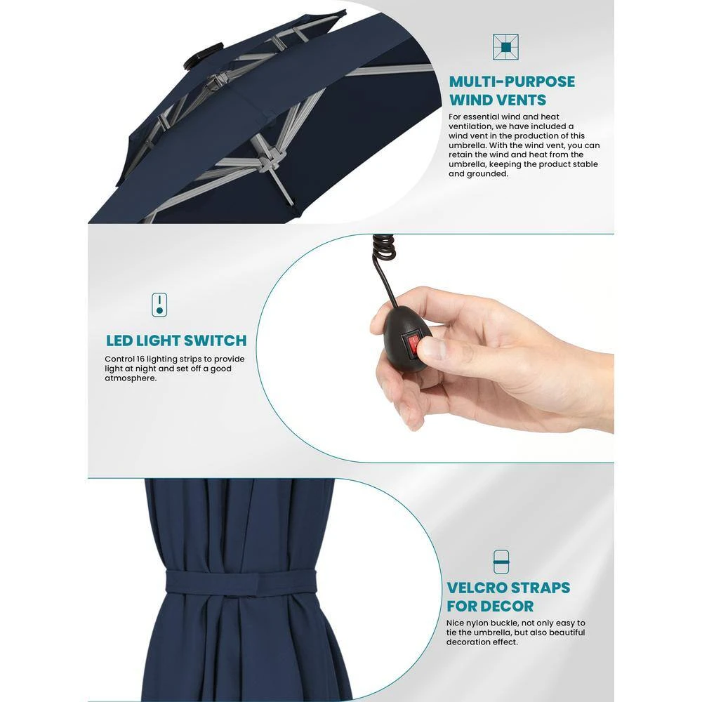 - High-quality 240/gsm polyester fabric, UV resistant, water-repellent and colorfast fadeless, all-aluminum umbrella bones and 8 heavy-duty ribs with LED light tubes, anti-oxidation spray painted, maintain a long period life