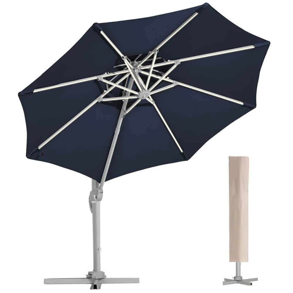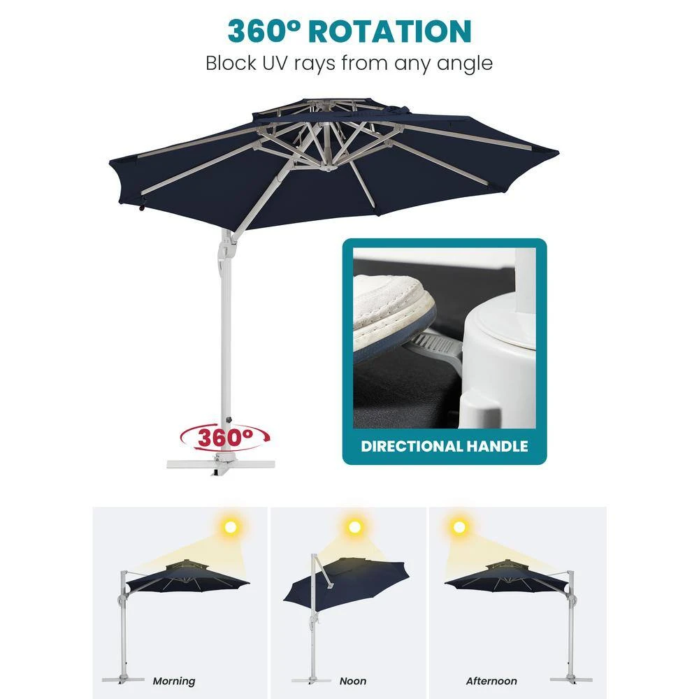 The Solar Cantilever Umbrella features vibrant colors that beautifully match the dark night. This 8.6 ft. tall umbrella has a sturdy, rust-resistant aluminum frame. Use its crank lift to manually tilt the 11 ft. Dia all-weather canopy for optimal shading. For safety, use the umbrella only in conjunction with a heavy-duty umbrella base (sold separately). Crank down umbrella and protect by the umbrella cover (free gift for you) when not in use.