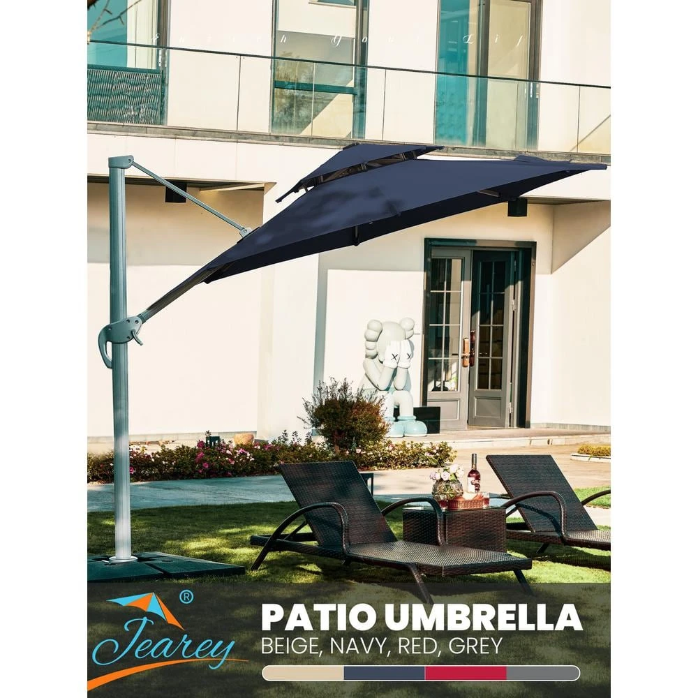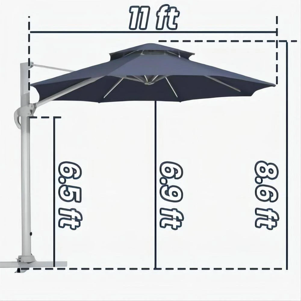 - Diameter of this patio umbrella is 11 ft., unique double-top canopy design for commercial and residential use, this cantilever umbrella has unique handle design and crank system, 6 height and angle to choose, 361° rotation for easier shading area control