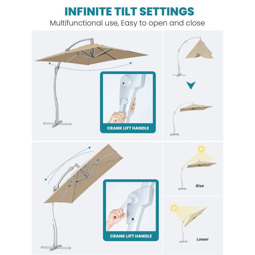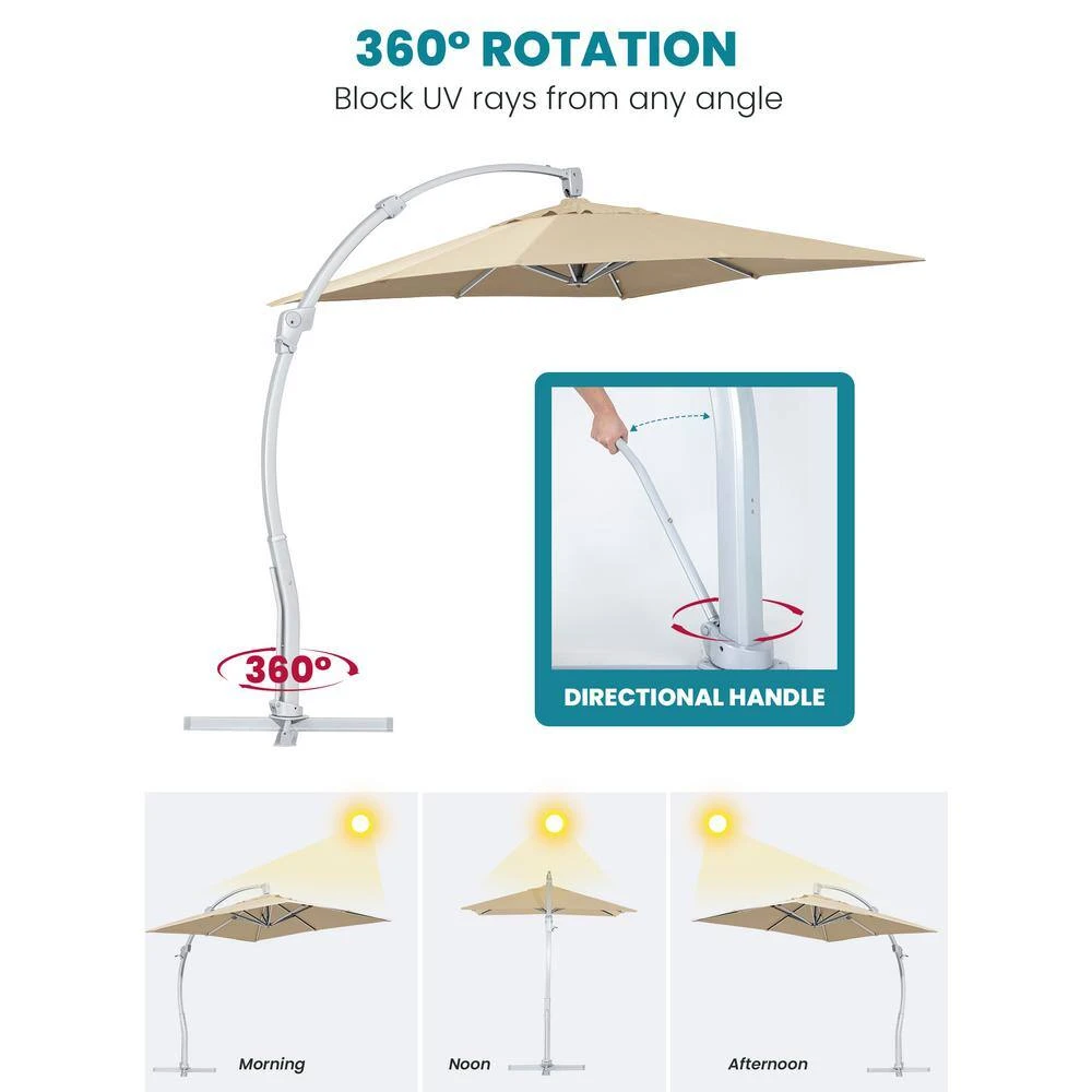 - Crank and tilt system design – this patio cantilever umbrellas is easy to opening and closing with it’s crank and tilt system convenient slide and lock operation system offers multiple angles of shading that helps you keep the Sun out from many angles and creates cool and comfortable environment for your family