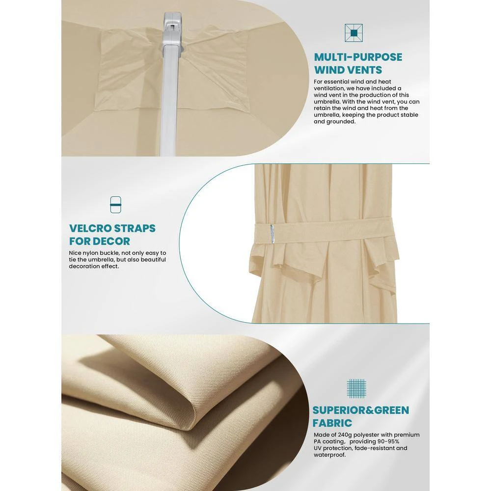 - Double top design – double top air vent to allow enough air flow and heat venting hot air or wind will flow through the multiple vents quickly which can make your patio hanging umbrellas more stable against windy condition and cooler underneath