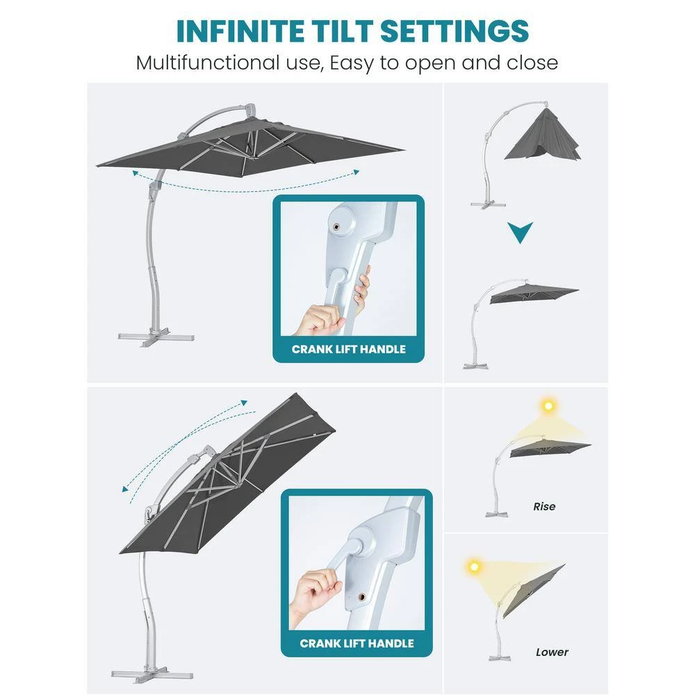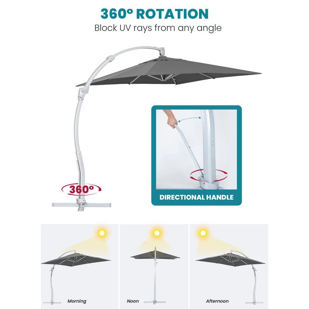 - Crank and tilt system design – this patio cantilever umbrellas is easy to opening and closing with it’s crank and tilt system convenient slide and lock operation system offers multiple angles of shading that helps you keep the Sun out from many angles and creates cool and comfortable environment for your family