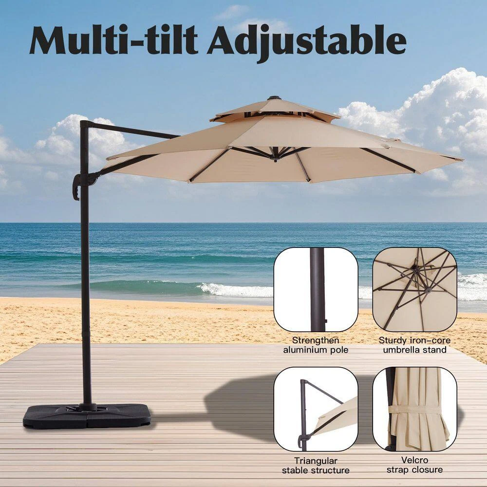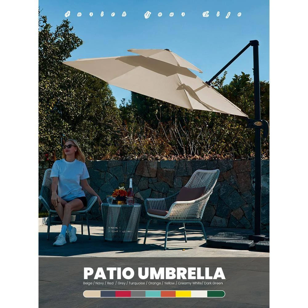 Transform your patio, deck, or poolside into a premium outdoor retreat with this complete All-in-One Cantilever Umbrella. Engineered for ultimate convenience and total control, this umbrella provides a massive shade footprint. Enjoy meals, conversations, and relaxation outdoors, comfortably shielded from the sun from dawn until dusk. This kit includes everything you need-the umbrella, the weighted base, and a protective cover- to upgrade your outdoor living space.