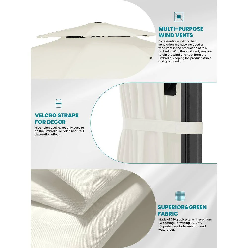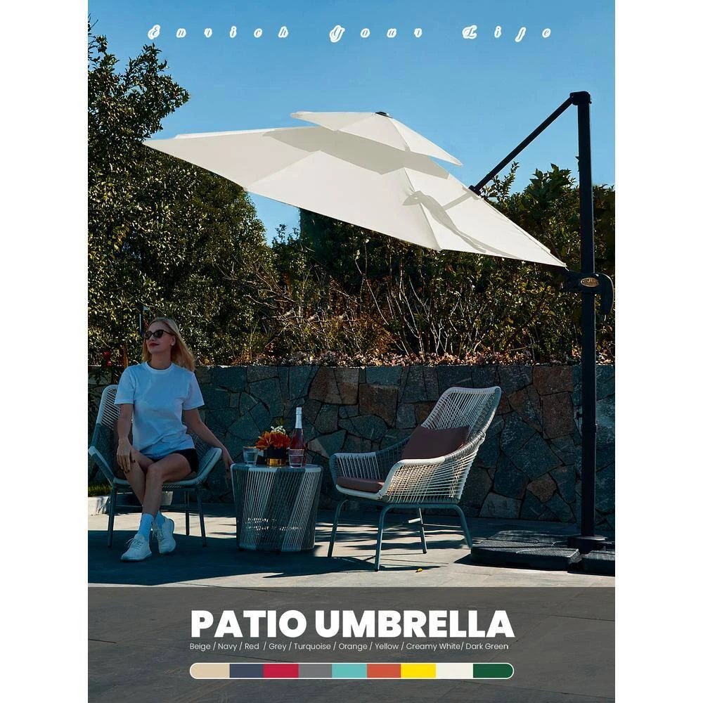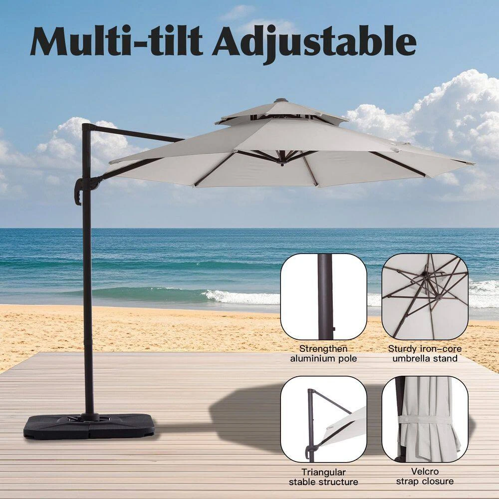 Transform your patio, deck, or poolside into a premium outdoor retreat with this complete All-in-One Cantilever Umbrella. Engineered for ultimate convenience and total control, this umbrella provides a massive shade footprint. Enjoy meals, conversations, and relaxation outdoors, comfortably shielded from the sun from dawn until dusk. This kit includes everything you need-the umbrella, the weighted base, and a protective cover- to upgrade your outdoor living space.