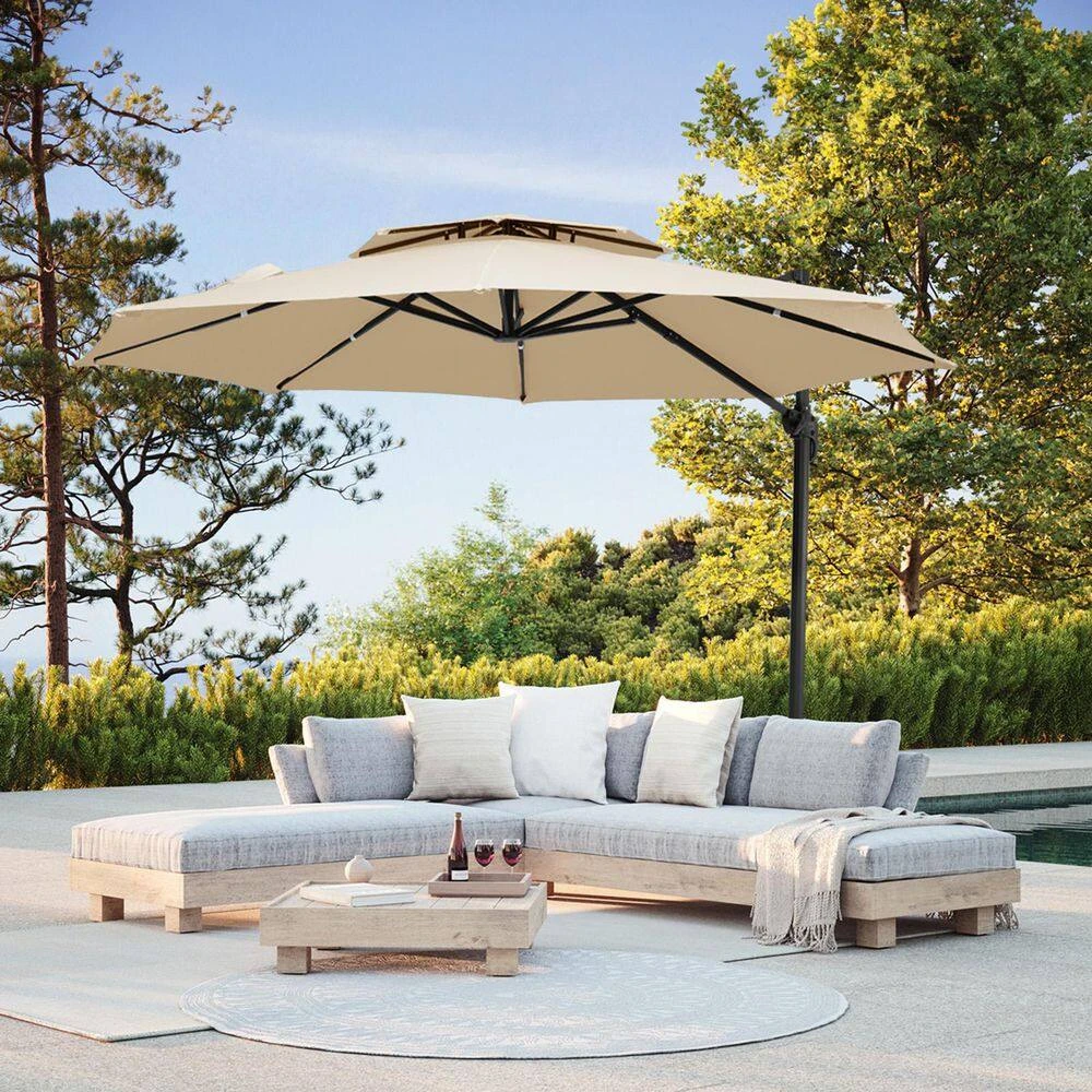 Relax outside day or night with our durable and chic 11 ft. cantilever patio umbrella. While the weather-resistant canopy protects you from the sun’s heat and harmful rays. Our umbrella can provide shade for a round or rectangle table with up to 9 chairs. You can use it in residential and commercial locations, e.g. gardens, yards, pool, deck, background beach, balcony, restaurant, and other outdoor areas.