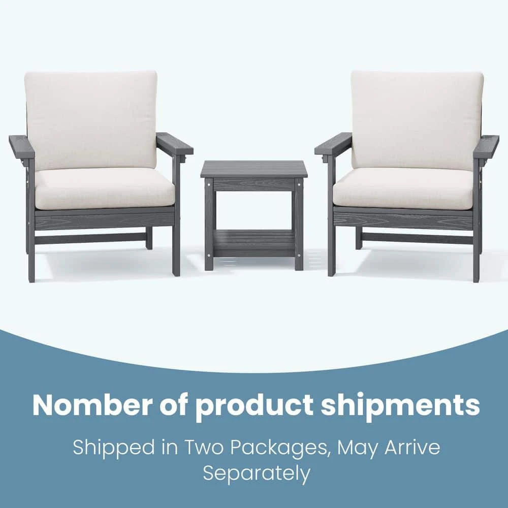 Gray 3-Piece Eco-Friendly HDPE Patio Seating Set Conversation Set With Beige Cushions And Side Table