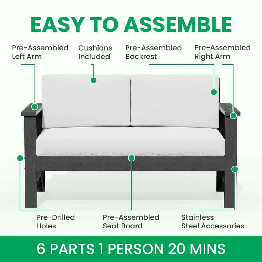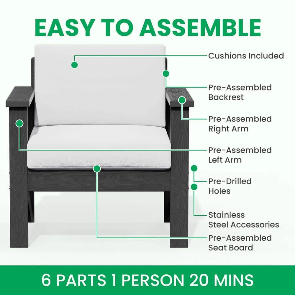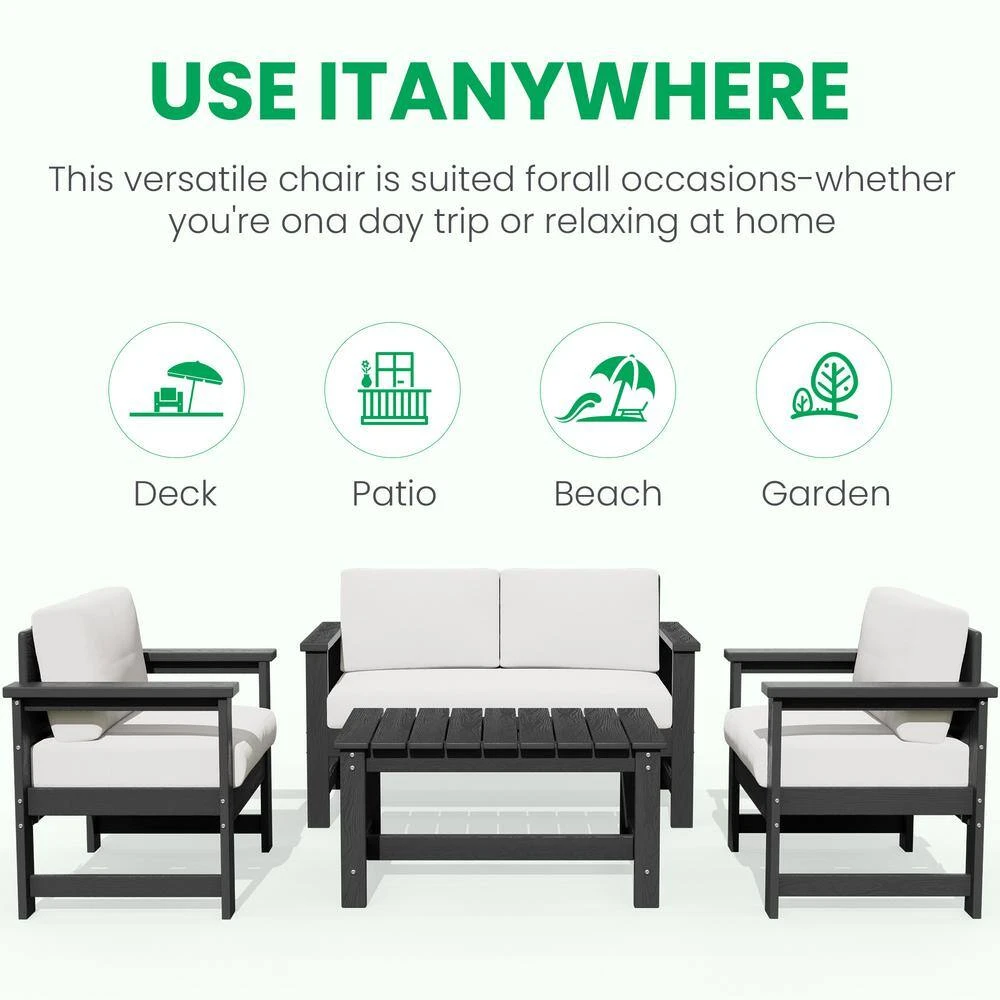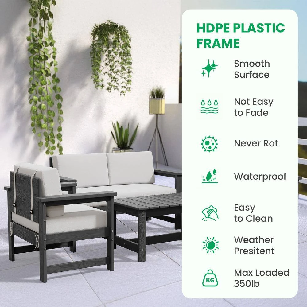 Transform your outdoor space with the Conversation Set. It includes a loveseat, 2-accent chairs, and a convenient coffee table, all designed for comfort and durability. The HDPE construction ensures weather resistance, while the cushions offer ultimate relaxation. This set is also easy to assemble, perfect for your patio, garden, or balcony. Whether hosting guests or enjoying a quiet afternoon, our conversation set provides both elegance and functionality to elevate your outdoor experience.