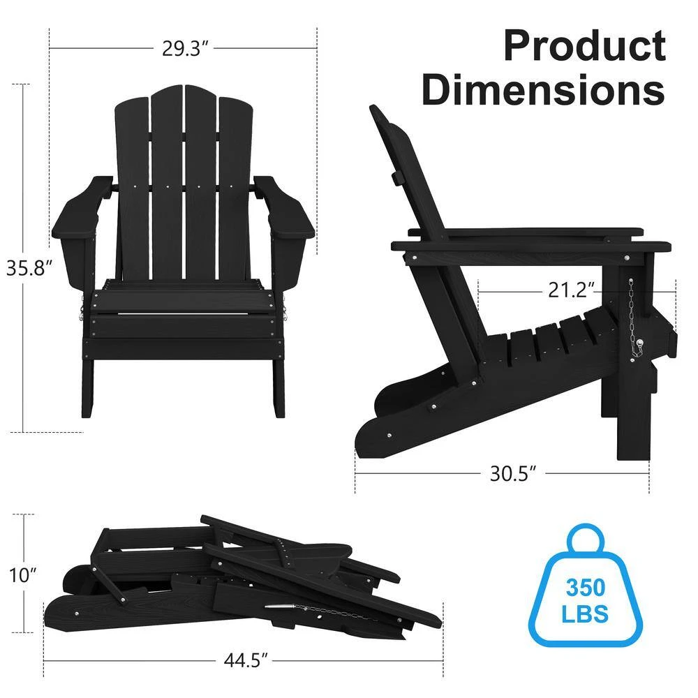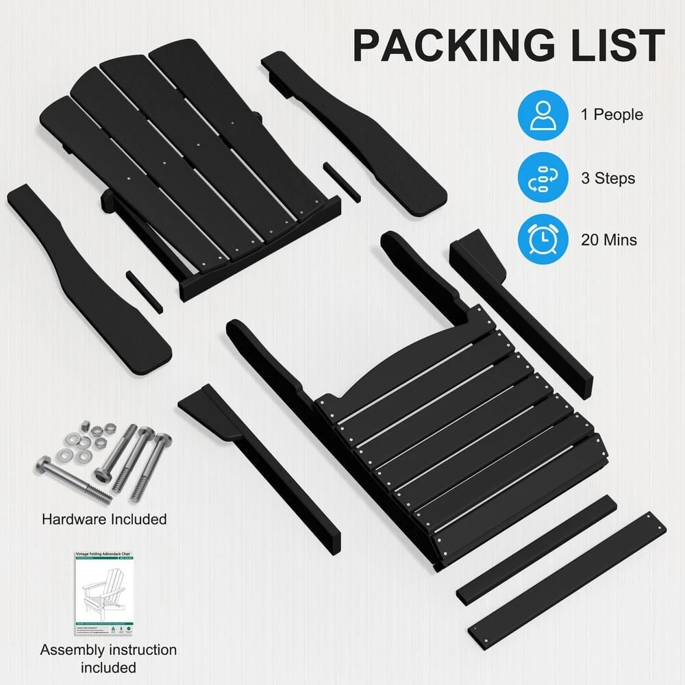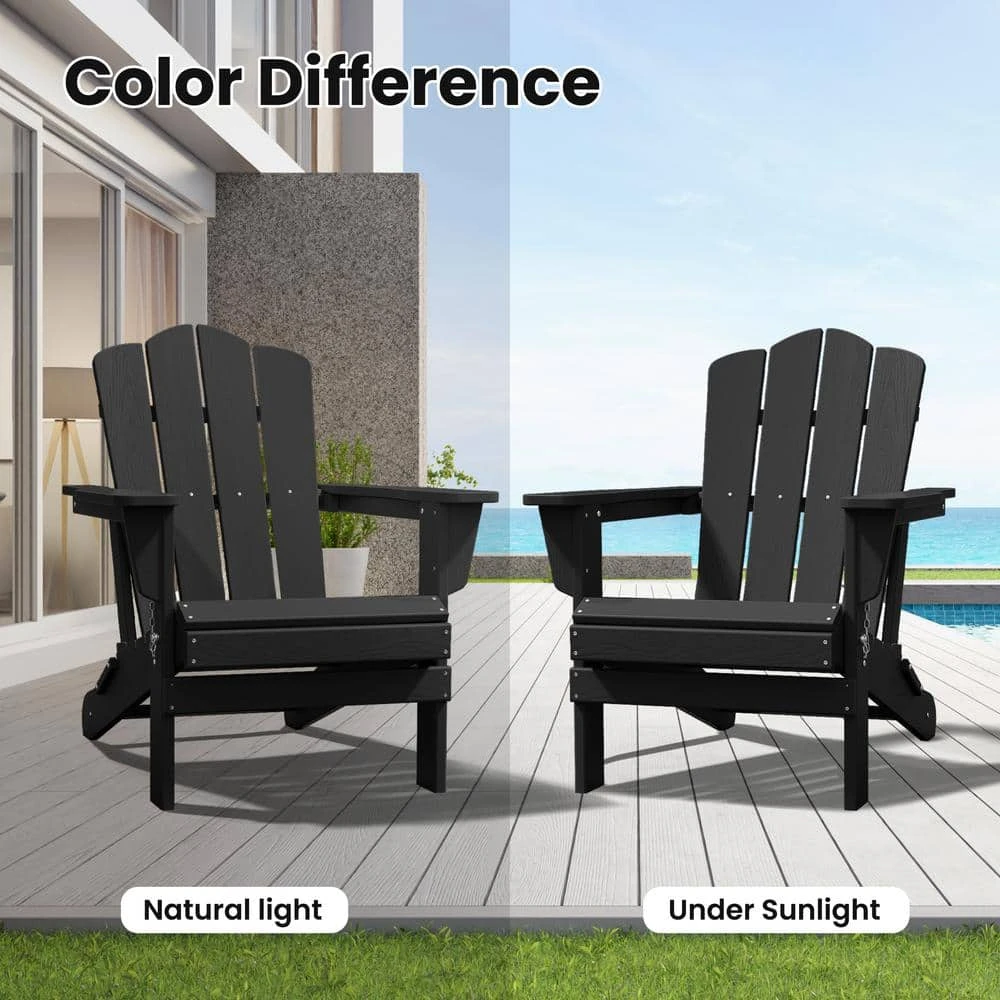 This product adopts improved resin material, new HIPS plastic, both with wood texture and plastic durability, more beautiful outlooking than the general high-density polypropylene material on the market. It shows good performance on waterproof, all weather-resistant, easy to clean, and could leave outside for years without cracking or peeling. More importantly, its foldable feature allows you to provide great help when you are not using it or when you go out to carry it. The ergonomic design features wide arms, a curved seat, and high back support, you can fully relax in it, or enjoy a pleasant time with your family and friends. No matter in your garden, backyard, or patio, the chairs all fit well with other furniture. And it is also the perfect partner for the firepit as the outdoor seat sets. All contents are packed in 1 box. Light assembly required.