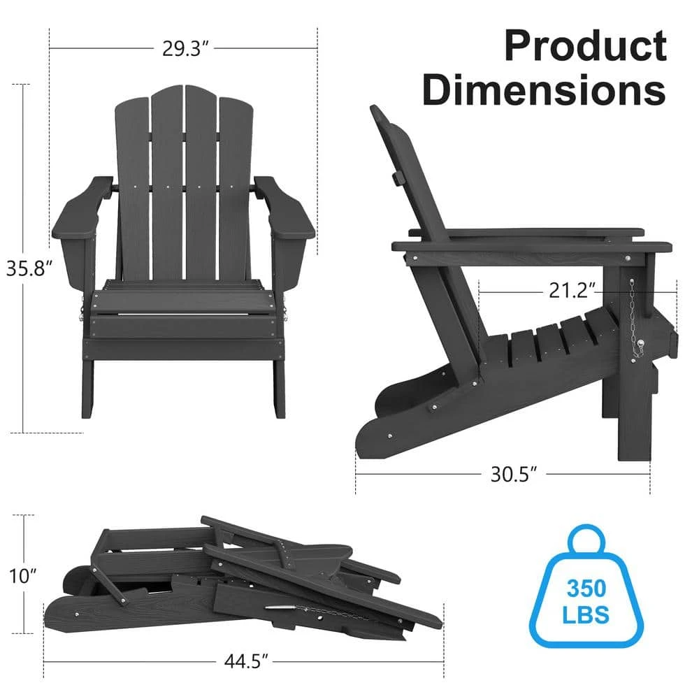 This product adopts improved resin material, new HIPS plastic, both with wood texture and plastic durability, more beautiful outlooking than the general high-density polypropylene material on the market. It shows good performance on waterproof, all weather-resistant, easy to clean, and could leave outside for years without cracking or peeling. More importantly, its foldable feature allows you to provide great help when you are not using it or when you go out to carry it. The ergonomic design features wide arms, a curved seat, and high back support, you can fully relax in it, or enjoy a pleasant time with your family and friends. No matter in your garden, backyard, or patio, the chairs all fit well with other furniture. And it is also the perfect partner for the firepit as the outdoor seat sets. All contents are packed in 1 box. Light assembly required. Please search the side table to match this adirondack chair by 321043534.