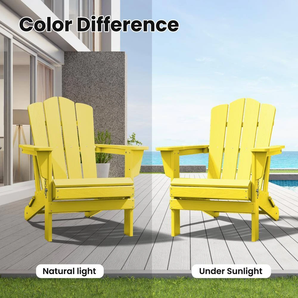 This product adopts improved resin material, new HDPS plastic, both with wood texture and plastic durability, more beautiful outlooking than the general high-density polypropylene material on the market. It shows good performance on waterproof, all weather-resistant, easy to clean, and could leave outside for years without cracking or peeling. More importantly, it’s foldable feature allows you to provide great help when you are not using it or when you go out to carry it. The ergonomic design features wide arms, a curved seat, and high back support, you can fully relax in it, or enjoy a pleasant time with your family and friends. No matter in your garden, backyard, or patio, the chairs all fit well with other furniture. And it is also the perfect partner for the firepit as the outdoor seat sets. All contents are packed in 1-box. Light assembly required.