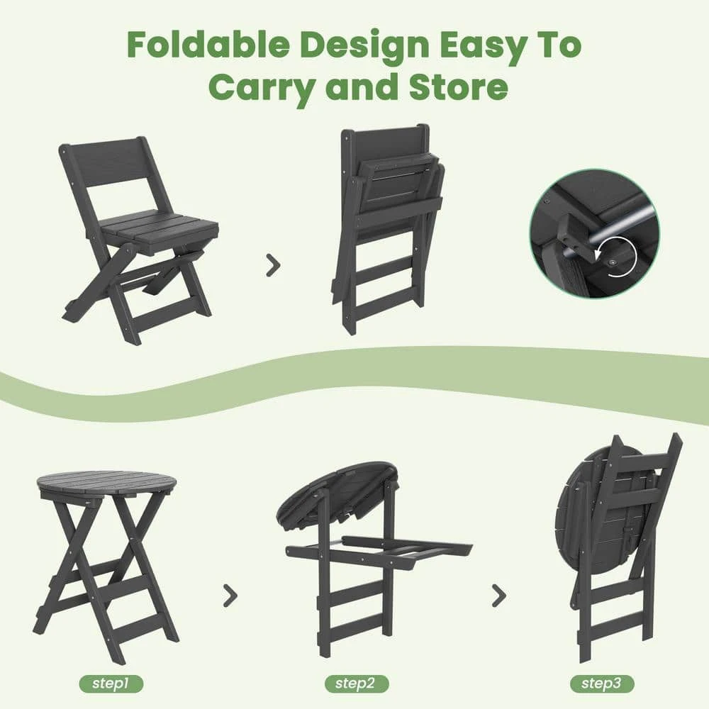 Crafted from durable, weather-resistant HDPE, our outdoor bistro set features a modern design that’s perfect for relax in patios, balconies, or gardens. Lightweight yet sturdy, it’s easy to set up and fold for storage. Enjoy meals al fresco with its comfortable seating and sturdy table, all while saving space. Elevate your outdoor lifestyle – order now and bring a touch of elegance to your backyard.